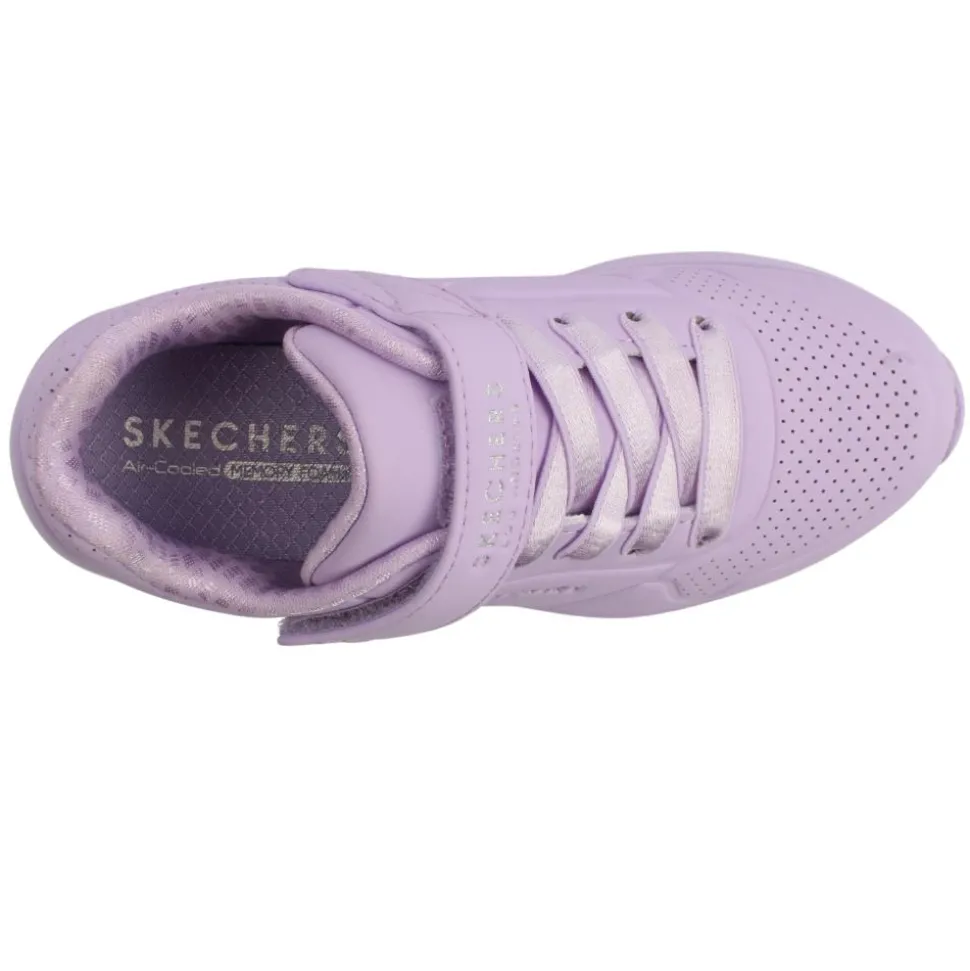 Experience unmatched comfort with the Skechers Street Uno Lite – 310451L. This fashion-forward trainer, easily washable by machine, showcases a sleek lavender synthetic upper. Boasting stretch laces and an adjustable Velcro strap, it offers a customised fit. With a Skechers Air-Cooled Memory Foam insole and platform wedge midsole, enjoy superior cushioning with every step.