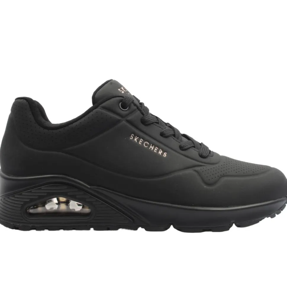 The Skechers UNO are one of the best selling ladies trainers from the Skechers shoes range. These trainers have an all black upper so are perfect for casual or workwear. This runner was designed using a Skechers ‘Air-Cooled Memory Foam’ insole & has a padded collar & tongue which adds to the comfort of the runner.