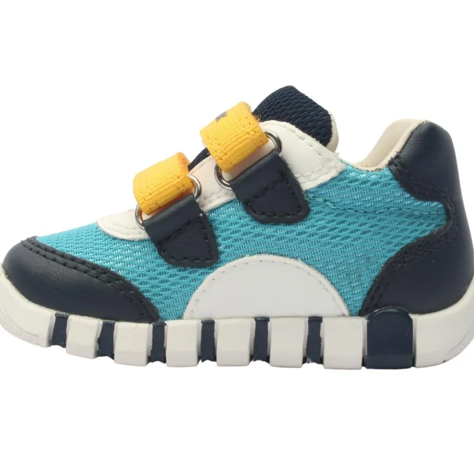 Boys shoes from Geox. This shoe has a soft blue upper with pops of blue & orange. The shoe has a removable, breathable leather insole. Antibacterial-treated insole contains a biocidal substance to perserve freshness. Super soft heel cushioning & toe protectors adds to the comfort of the shoe.