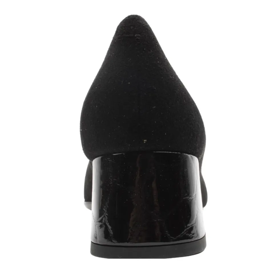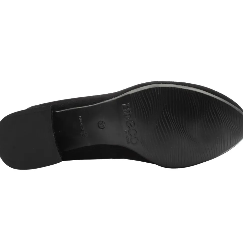 Low block heel shoes from Bioeco by Arka Shoes, in a black suede upper with stiking brooch detail. Crafted with precision and care, these shoes feature the innovative Soft Step System, providing an unparalleled walking experience. Designed with a H wide fitting, these shoes cater to those seeking both style and roomy comfort. The spacious design ensures that your feet have the freedom they need, making these shoes an excellent choice for all-day wear without compromising on elegance.