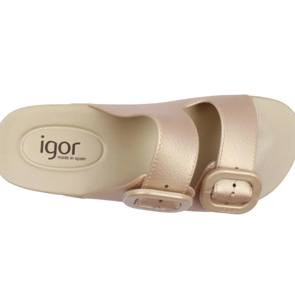 Women’s sandals from Igor shoes. Step into comfort with lightweight and flexible sandals. Designed with a sleek Pearly gold upper and double buckle closure allowing an adjustable fit.