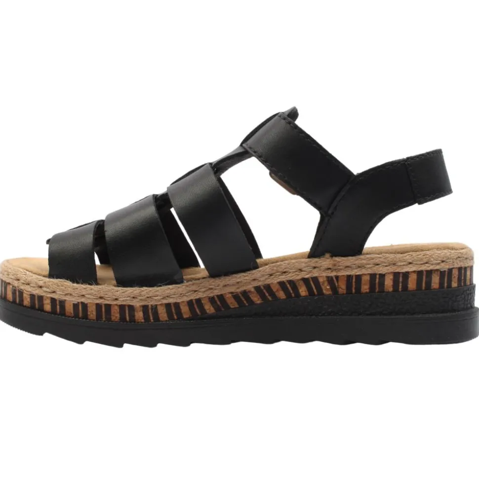 Step into effortless style and comfort with the Rieker V7904 sandal. Designed with a sleek black upper and an espadrille-inspired low wedge heel. Crafted with a soft leather upper and featuring Rieker’s Antistress cushioned insole, it provides exceptional comfort and support for all-day wear. Perfect for casual wear, this lightweight sandal is a summer essential.