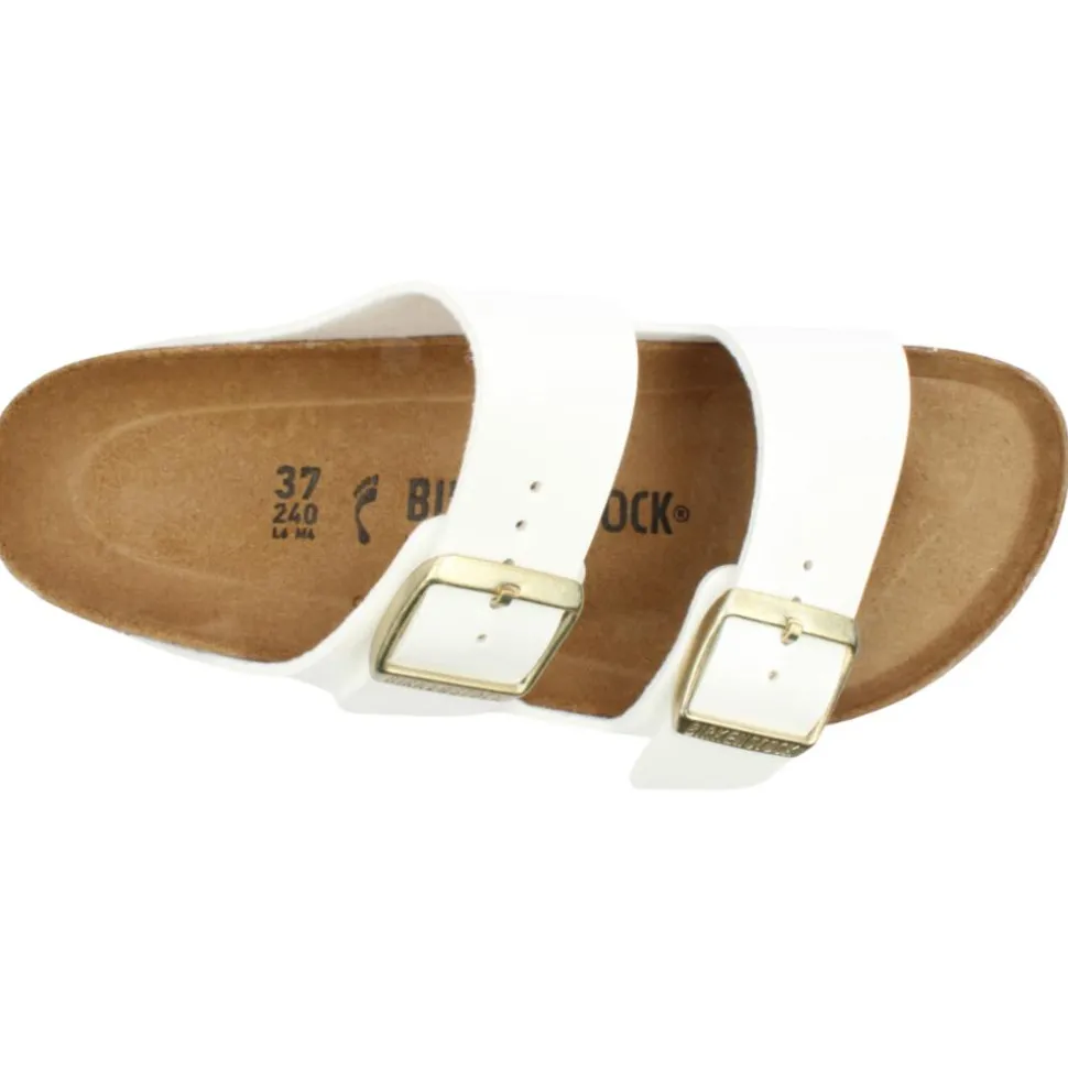 The Birkenstock Arizona sandals in a white patent upper are the perfect addition to your Summer wardrobe.The classic two-strap design and signature contoured footbed provide unparalleled comfort and support, making them perfect for all-day wear.Whether you’re strolling along the beach or running errands in the city, these Birkenstock sandals are a versatile and stylish choice.