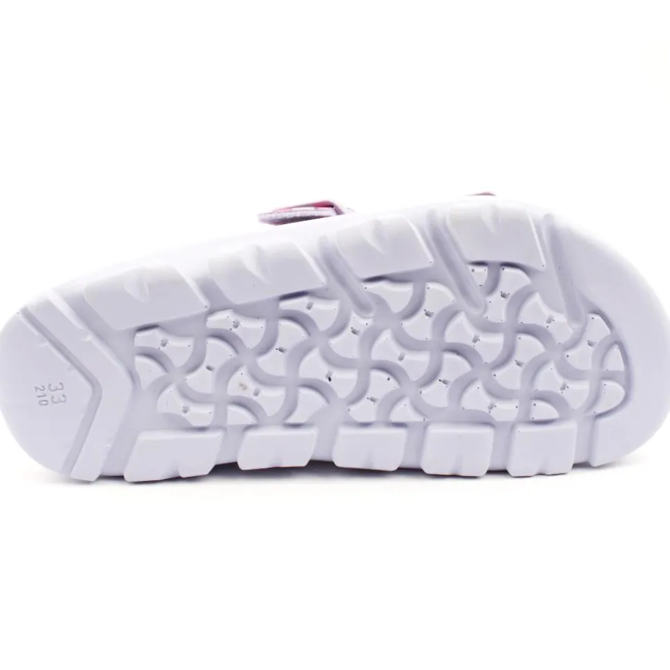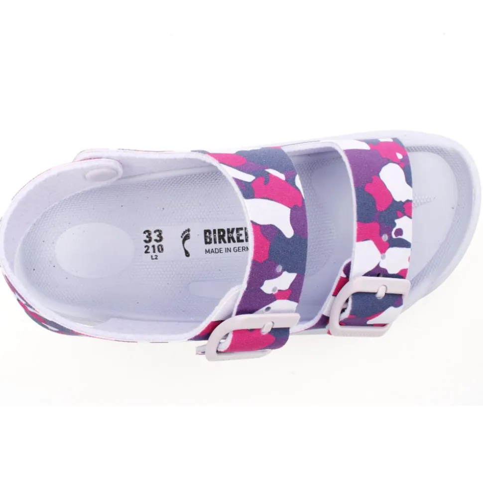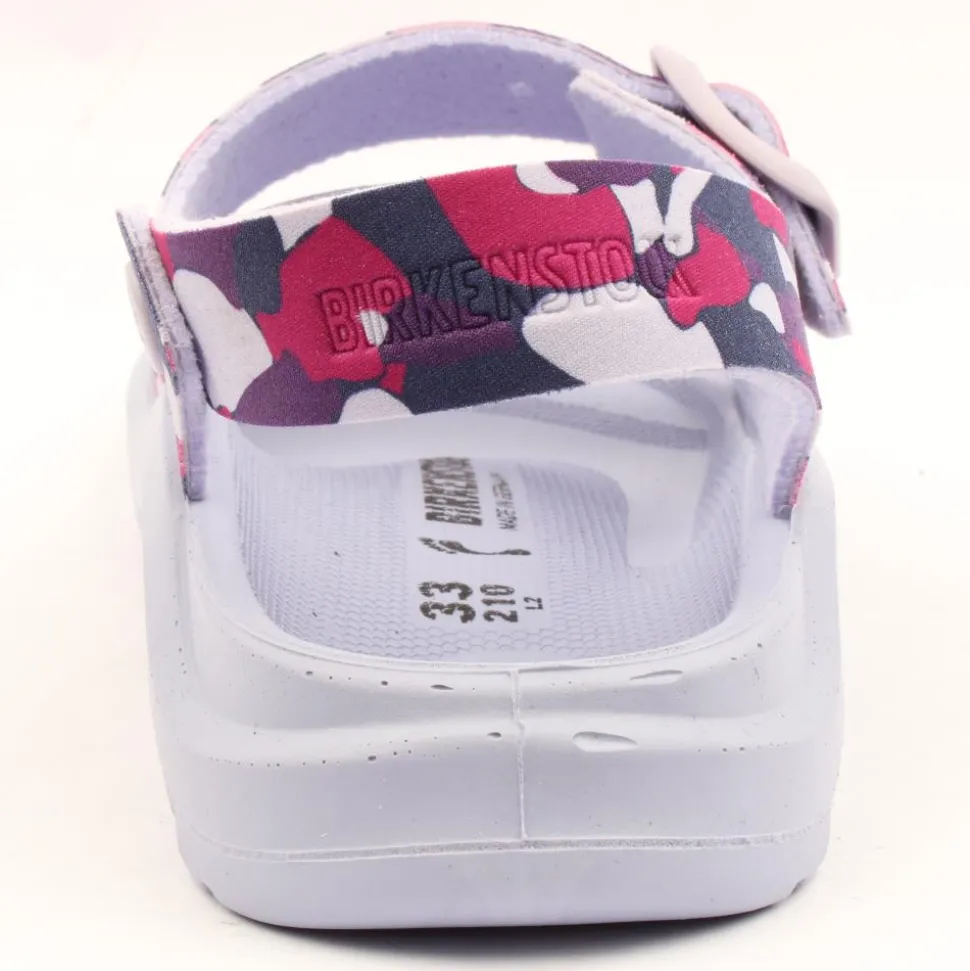 Colourful camouflage Girls Birkenstock sandal. The Birkenstock Mogami is perfect for Summer adventures thanks to the waterproof footbed. The upper is made from skin-friendly, hard-wearing synthetic material. This sandal is flexible & durable in any terrain. The buckle closure allows for an adjustable fit. This mule is a ‘narrow width’.