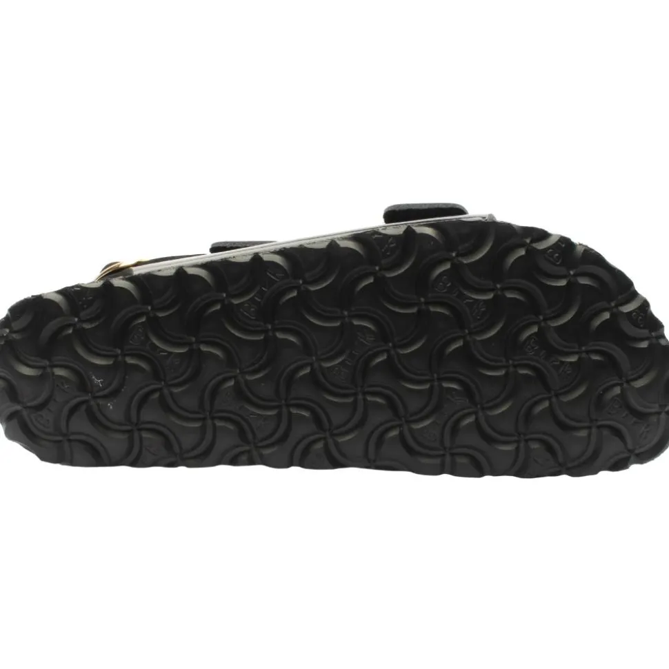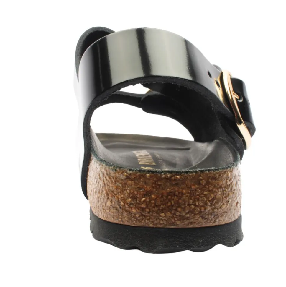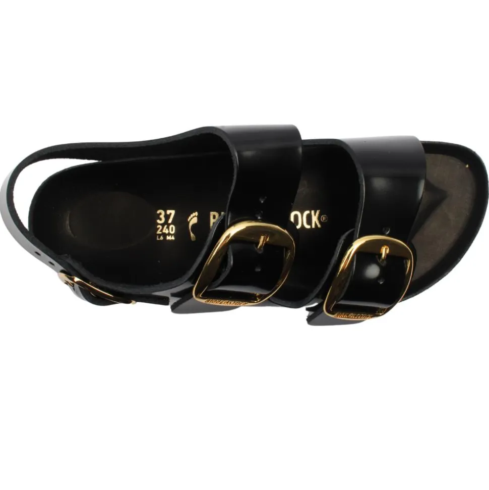 Ladies Birkenstock sandals with a heel strap for a secure fit. The Birkenstock Milano Big Buckle features a large, elegant pin buckle. These ladies sandals feature a high shine black upper. The signature contoured footbed provides unparalleled comfort and support, making them perfect for all-day wear. The lining of this footbed is covered with soft smooth leather and matches the shoe in color.