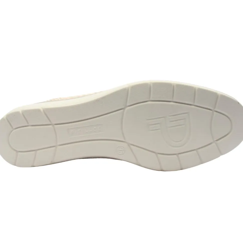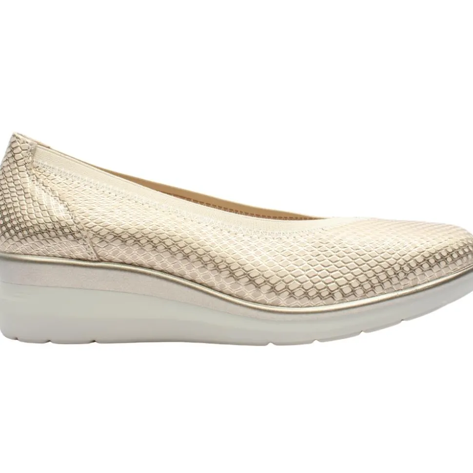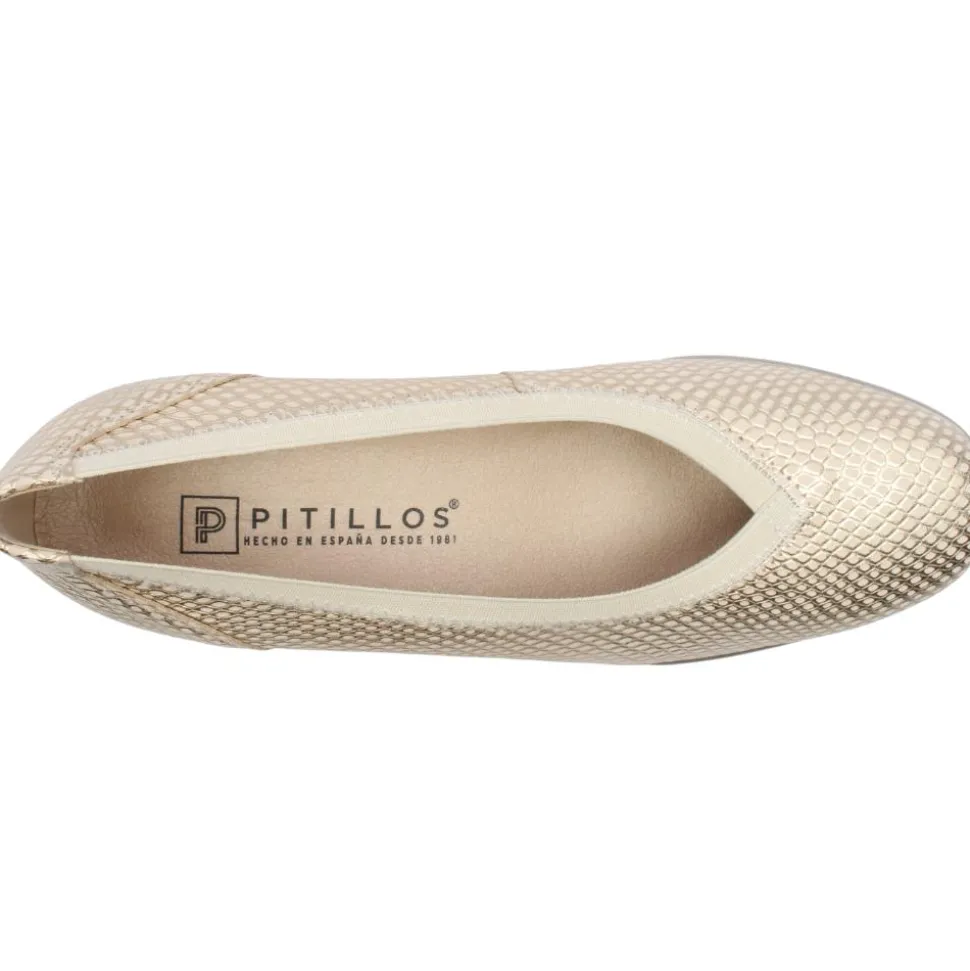 Elevate your everyday style with the Pitillos 10373 Ladies’ Shoe in a chic gold finish. Crafted with a soft leather upper and elastic trim around the rim, this shoe offers both comfort and support, ensuring a secure fit throughout the day. A Cushioned Removable Leather Insole which is Soft and breathable for all-day comfort, with the option for custom orthotics. A Small Wedge Outsole which Offers a gentle lift for added height without compromising on stability or comfort. A Neutral Silver Color, a versatile shade that complements a wide range of outfits, from casual to dressy.