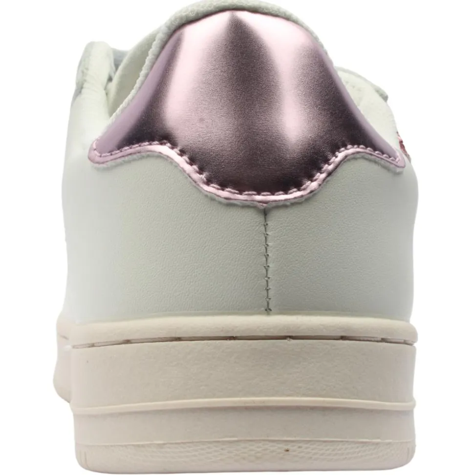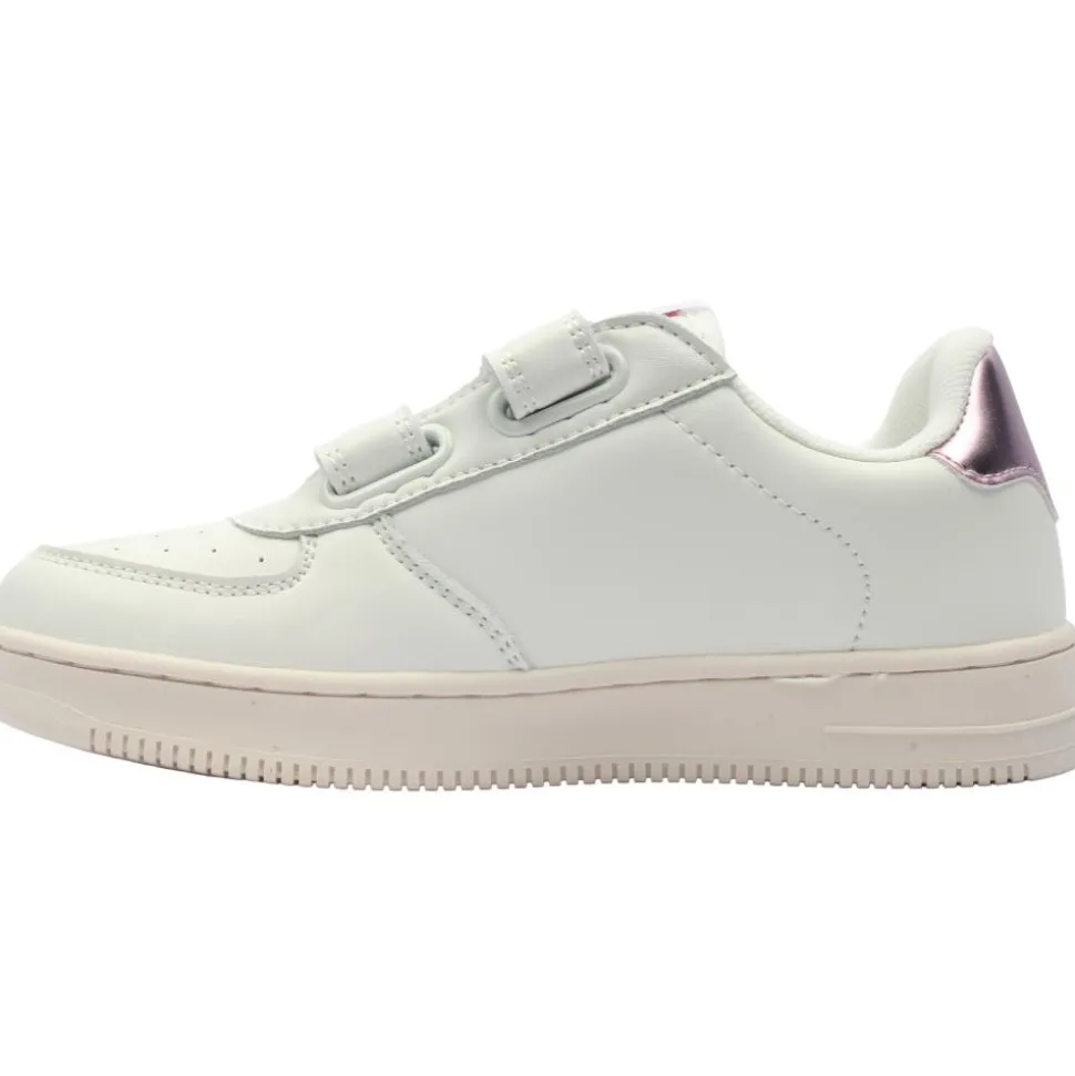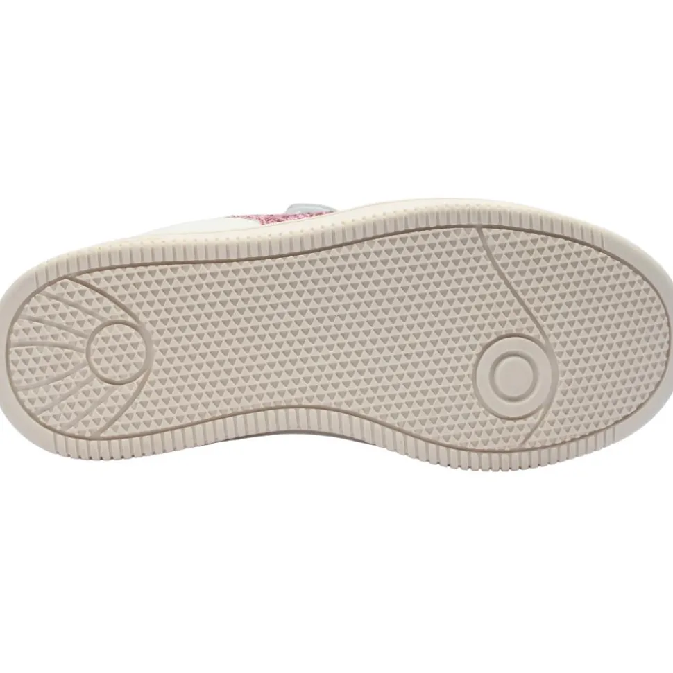 Kids girls shoes from Victoria shoes. These classic white sneakers feature a playful and glittery pink “V” detail on the side. The easy-to-use Velcro closure ensures a secure fit and hassle-free wear. Lightweight and durable, these shoes blend everyday practicality with a fun, stylish design.