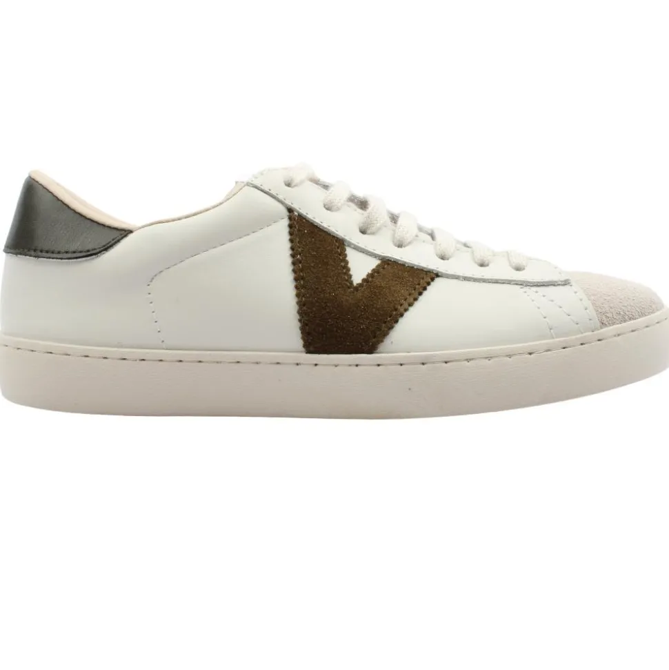 Everyday ladies trainers from Victoria shoes These Victoria trainers have a white leather upper with khaki green ‘V’ branding on the side of the trainer. The perfect trainer for everyday casual wear!