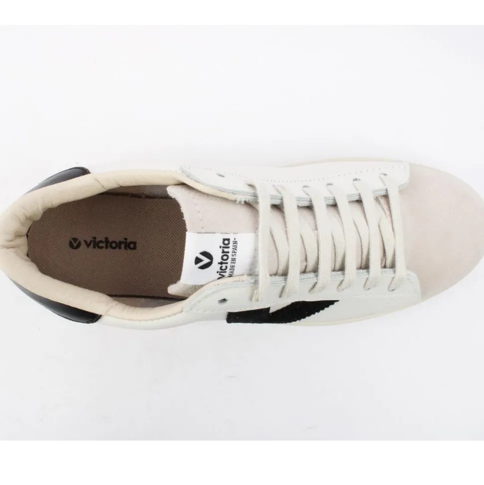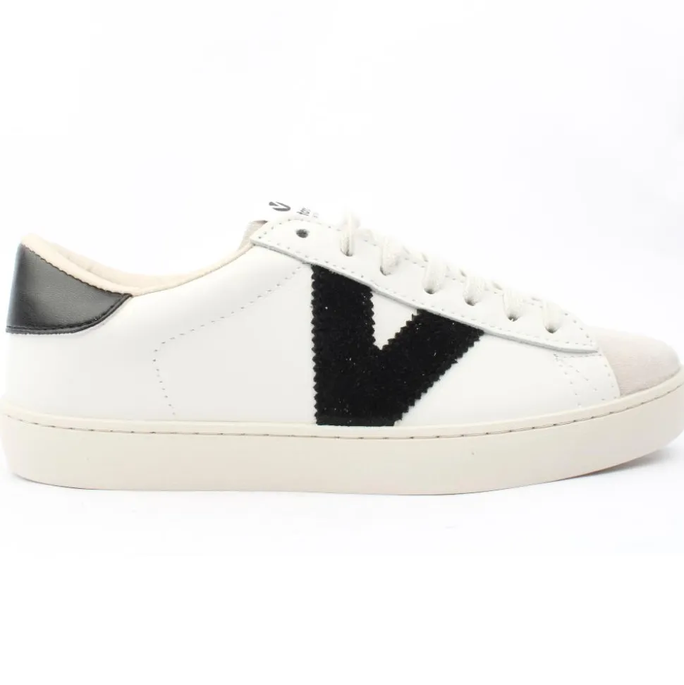 Casual ladies trainers from Victoria Shoes. These ladies Victoria trainers have a white leather upper with black ‘V’ branding on the side of the trainer. The perfect trainer for everyday casual wear!