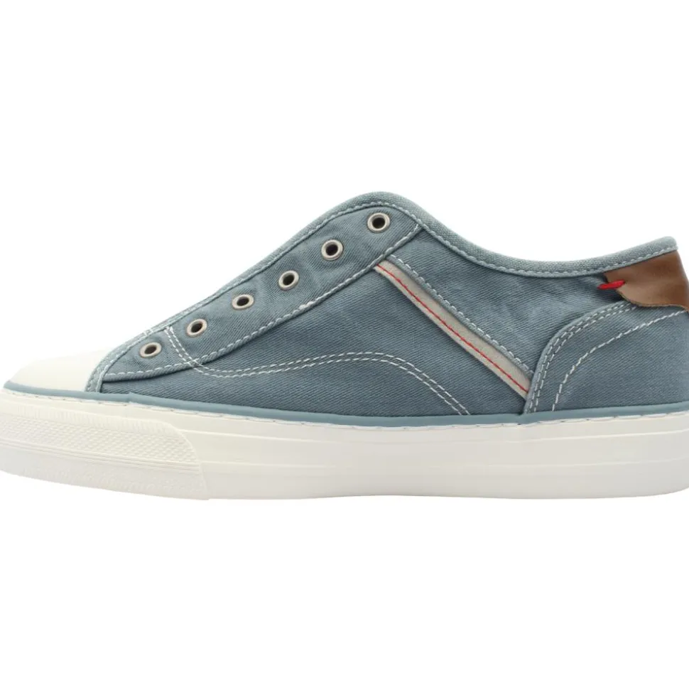 Introducing the Women’s Canvas Trainers from Mustang Shoes. These sneakers feature a charming blue denim upper complemented by tan heel cap accents. Pair them with jeans for a fabulous look that’s perfect for spring and summer 2024!