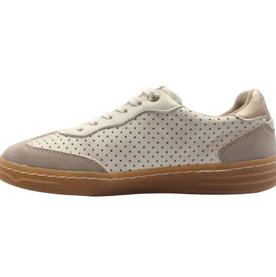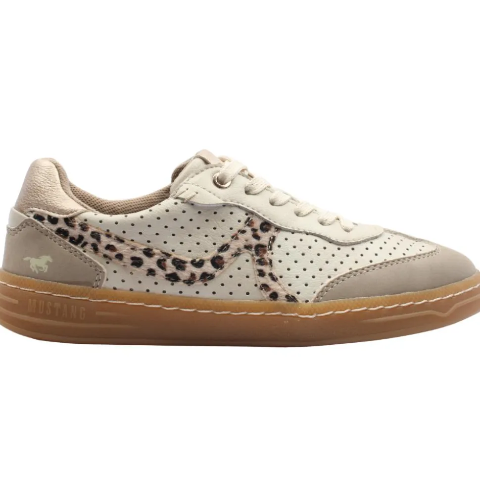 Ladies casual shoes from Mustang shoes. These trainers feature a beige or ivory synthetic leather upper, accented with a distinctive leopard print design along the sides. Inside, the shoes boast a ‘True Denim’ designed insole, providing a comfortable and breathable experience for all-day wear.These Mustang shoes are versatile and can effortlessly complement casual outfits.