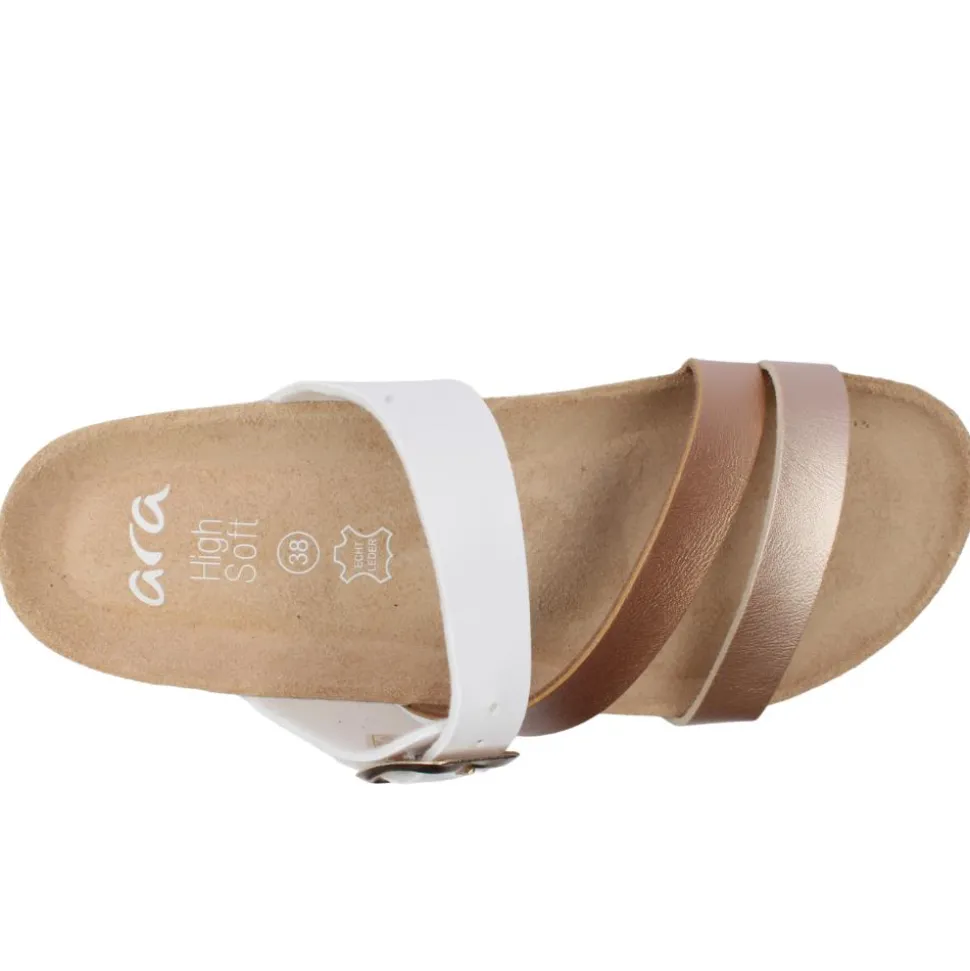 Slip on ladies sandals from Ara Shoes latest collection. These sandals boasts a strappy upper in three tones One buckle stap offers adjustability for a personalised fit. Featuring Ara’s High Soft insole, it delivers superb underfoot cushioning for all-day comfort. Completed with a flexible outsole, this mule combines style and ease seamlessly. This mule is a G width for added comfort.