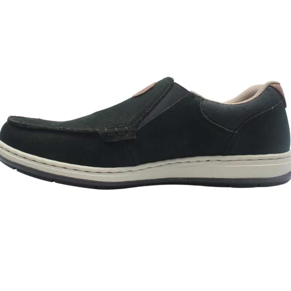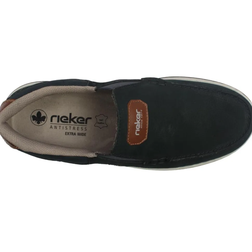Step into comfort with these wide fitting mens shoes from the Rieker shoes collection . These mens slip on shoes are designed with a navy nubuck leather upper.The Rieker Antistress insole provides cushioned support that adapts to your foot, ensuring all-day comfort w ith elastic gussets on either side, these slip-ons offer an easy, secure fit.