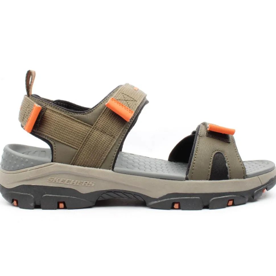 Take to the trails in comfort and rugged style with the Skechers Relaxed Fit Mens sandal. Crafted with a smooth and durable synthetic upper, this sandal features an adjustable velcro strap closure for effortless on and off. Enjoy enhanced comfort with the Skechers Luxe foam cushioned and contoured footbed, along with a supportive shock-absorbing midsole.