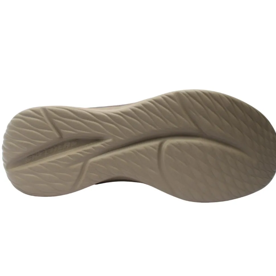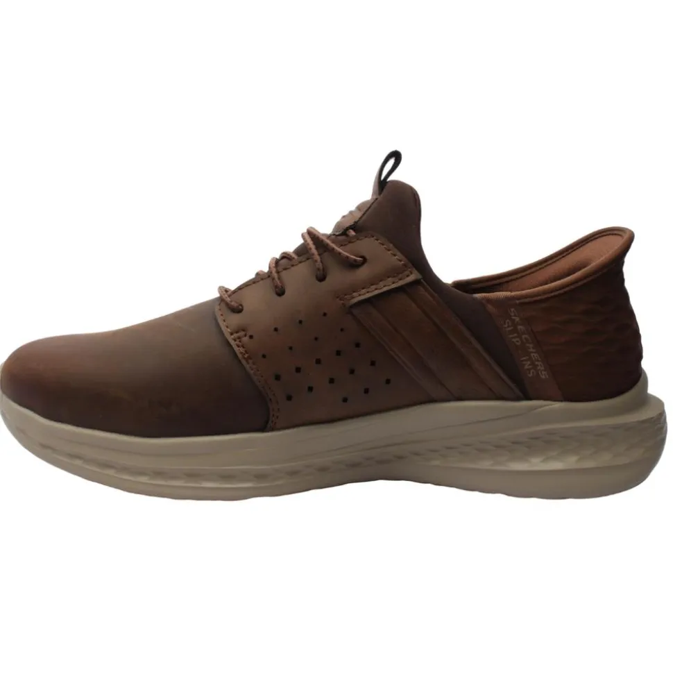 The Mens Skechers Hands Free Slip-ins (style number 210828) in Dark Tan are designed for effortless wear and superior comfort. Featuring Skechers exclusive Heel Pillow, these shoes securely hold your foot in place, allowing you to simply step in and go without using your hands. The Air-Cooled Memory Foam insole an gogamat arch provides breathable cushioning for all-day comfort. The lightweight and flexible design ensures ease of movement, making these slip-ons ideal for daily activities. Relaxed Fit for those with widder feet.