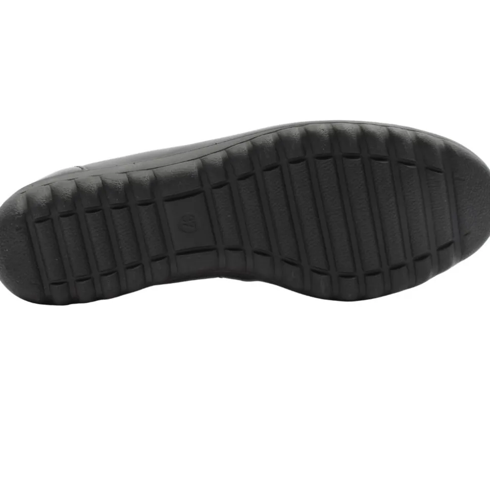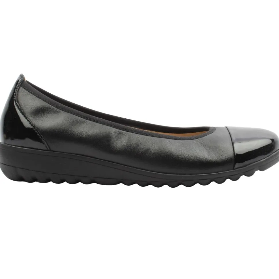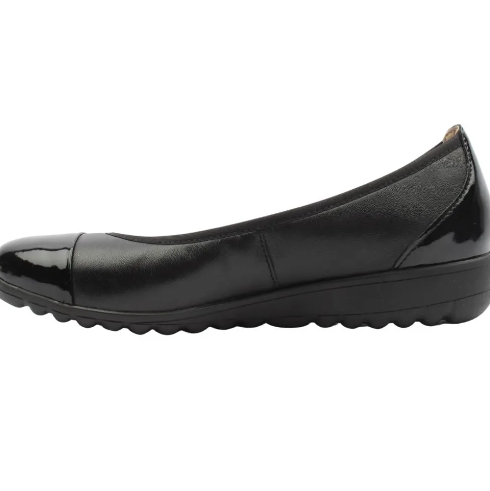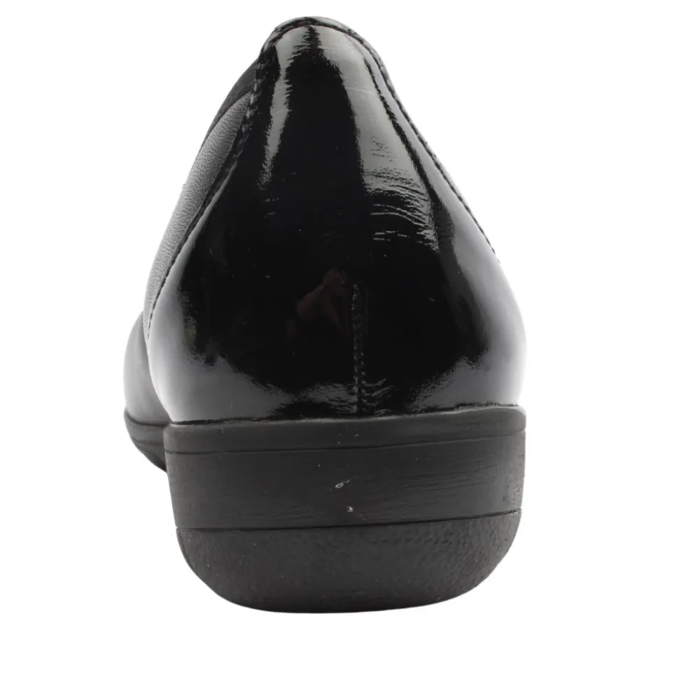 Ladies slip on pumps from Caprcie shoes. This shoe has a smooth black leather upper with an elasticated topline which allows for easy on/off while keeping the foot secure. The patent toe & heel cap adds to the appeal of the shoe. The shoe has a removable leather insole. This shoe is also a G width.