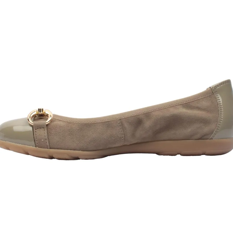 Ladies slip on pumps from Caprice shoes. This shoe has a black suede upper with an elasticated topline which allows for easy on/off while keeping the foot secure. The patent toe & heel cap combined with the gold buckle detail adds to the appeal of the shoe. The shoe has a leather insole and is a G width fit for added comfort.
