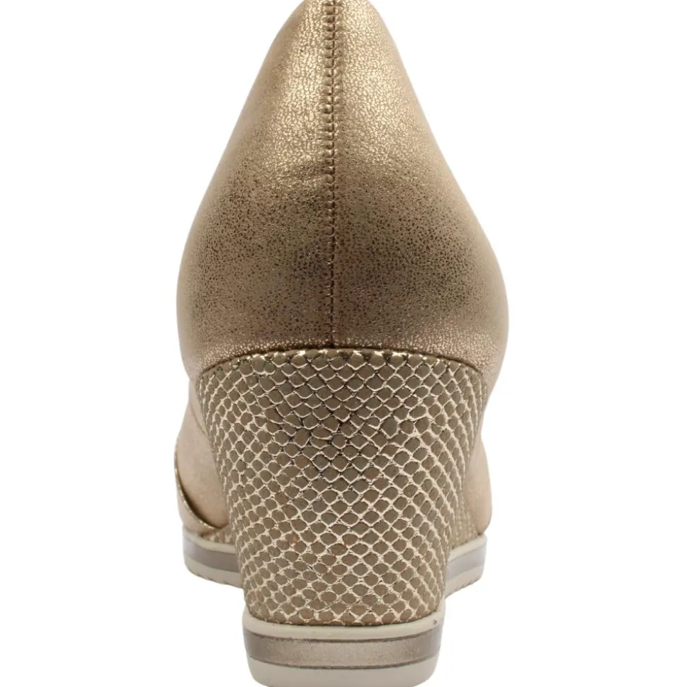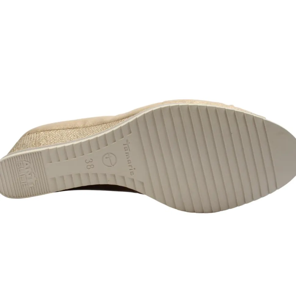 Step into elegance with these Tamaris wedge shoes in a gold finish, a perfect blend of sophistication and comfort. Designed for all-day wear, the shoe features a luxurious leather Tamaris “Touch It” insole, which adapts to the shape of your foot for superior comfort. The wedge heel provides effortless elevation, offering both style and stability. Whether for a special occasion or adding a touch of elegance, this Tamaris wedge is a must-have addition to your wardrobe.