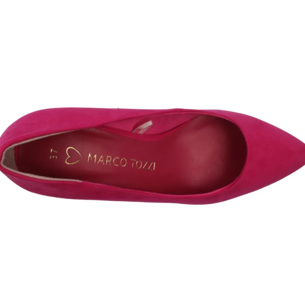 Stylish pink court shoes from the Marco Tozzi collection. Crafted with a vibrant faux suede upper and featuring a pointed and uniquely shaped heel, this shoe exudes elegance. Enhanced with cushioned insoles, it ensures both style and comfort.