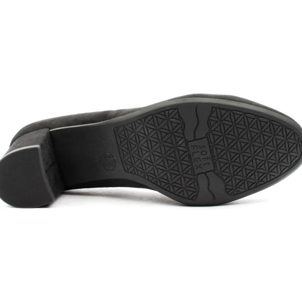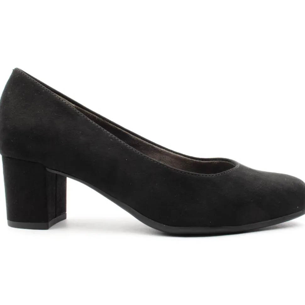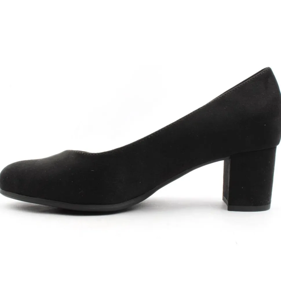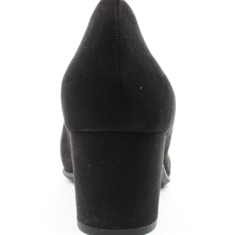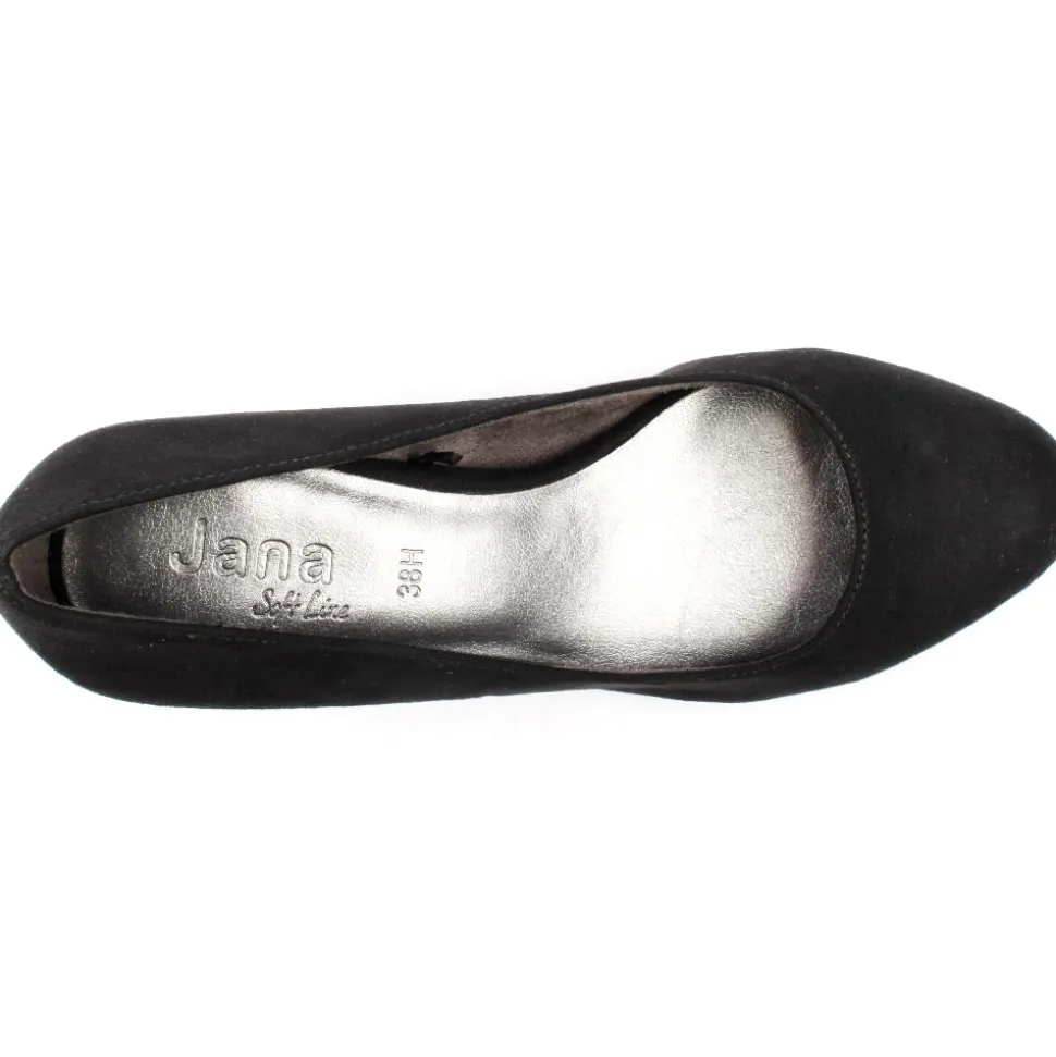 Wide fitting dressy shoes from Jana Shoes . This court shoe has a faux suede black upper. They feature a round toe and a sturdy block heel that provides stability and comfort making it suitable for all-day wear at work or special occasions. The shoe is a ‘H’ wide fittng style which will provide extra toe room, it also has a padded insole for added comfort.