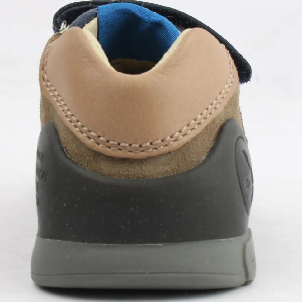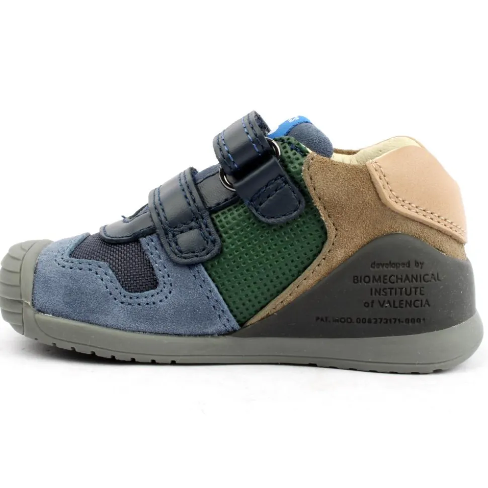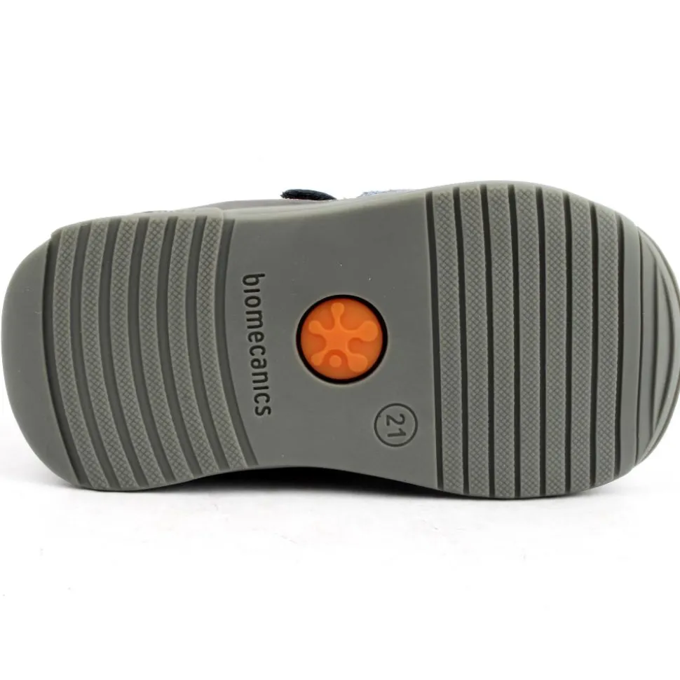 Boys shoes Biomecanics. This boys shoes has a soft navy upper with a double velcro closure and fold down tongue for easy on and off. Removable antibacterial insoles.The reinforced heel and toe protect busy little feet!