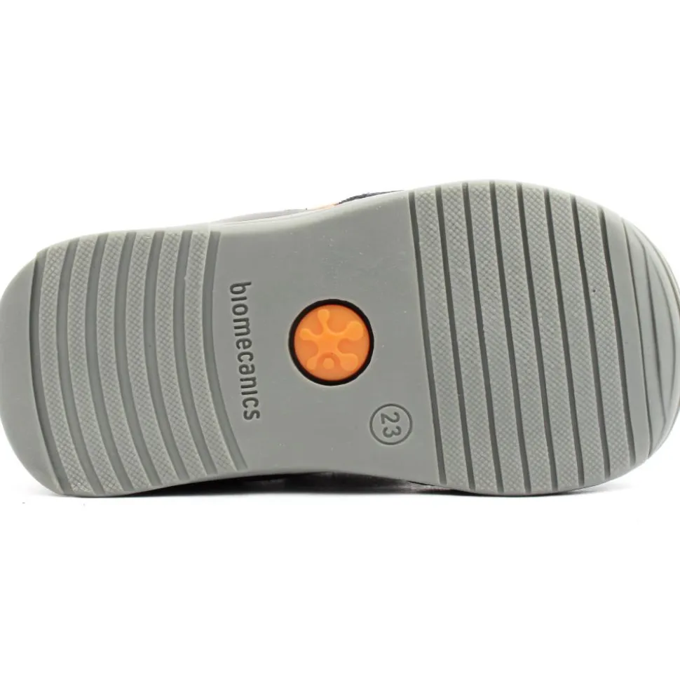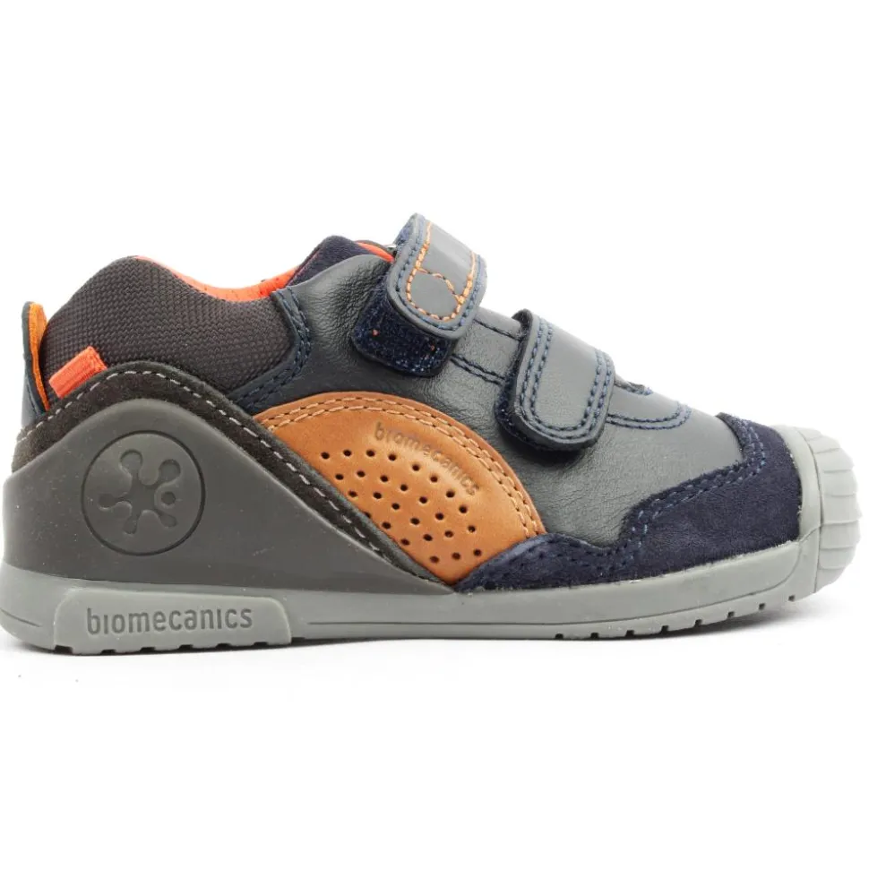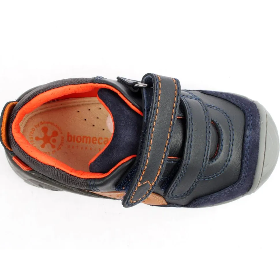 Boys shoes from Garvalin by Biomecanices. This boys shoes has a soft navy upper with pops of tan & fine stitch. This style features a double velcro closure and fold down tongue for easy on and off. Removable antibacterial insoles.The reinforced heel and toe protect busy little feet!