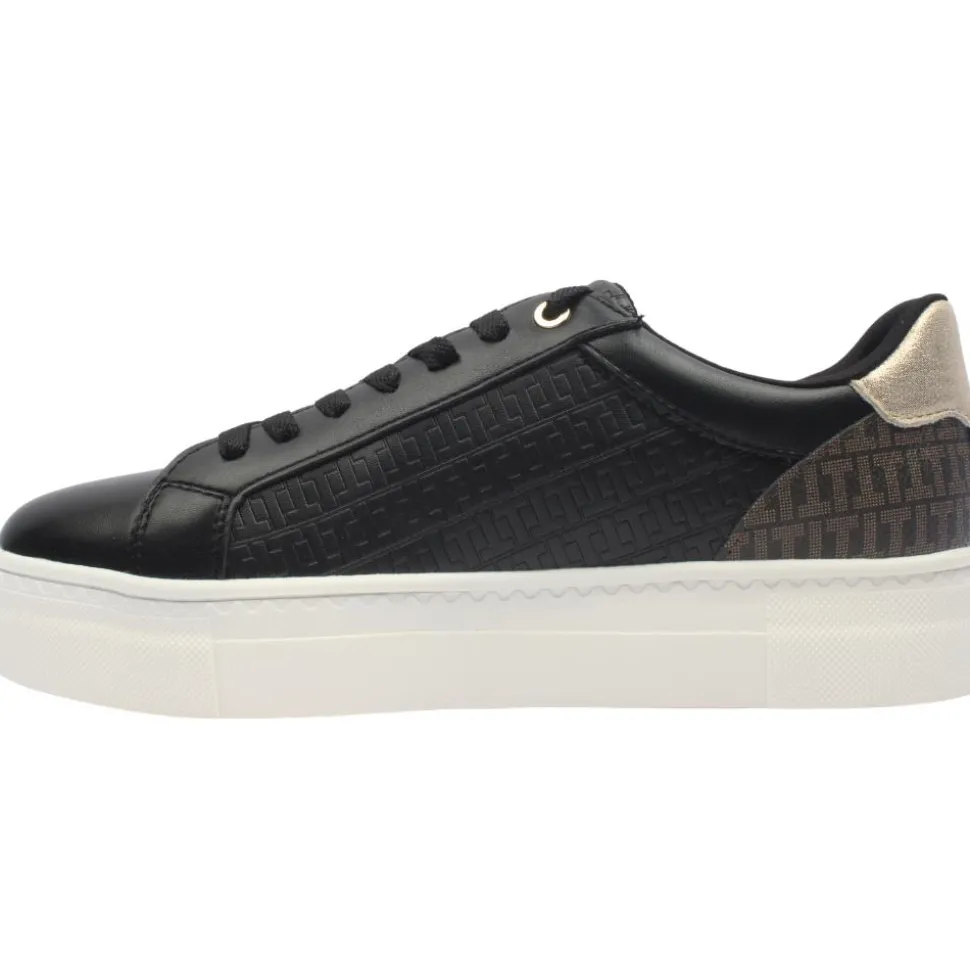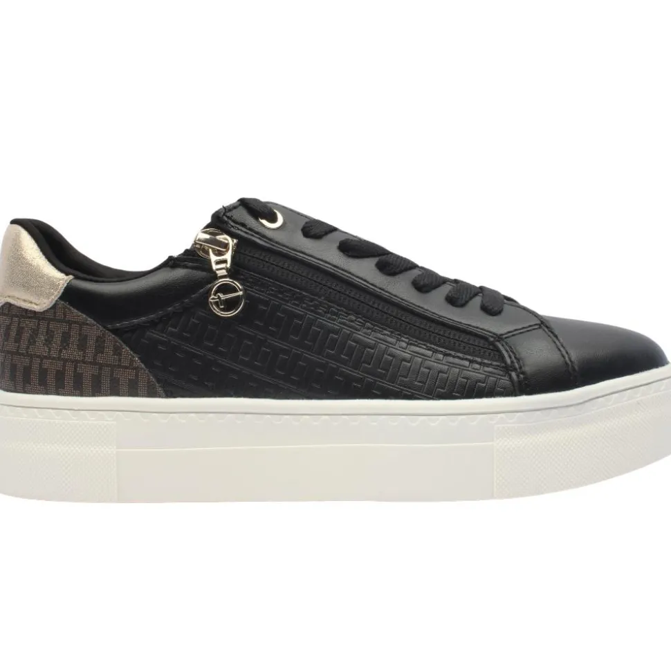 Casual ladies trainers from Tamaris shoes with designer look.These Tamaris trainers have a black upper with gold detailing. The zip and lace closure offer a customisable fit and easy on and off.