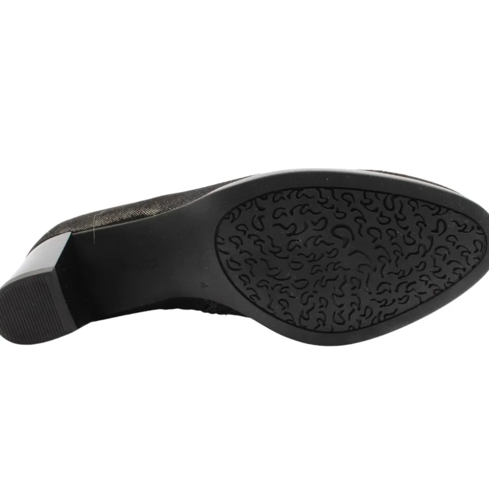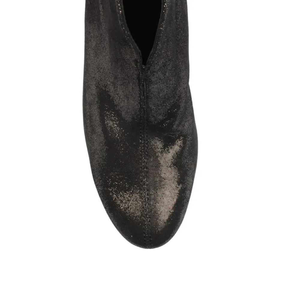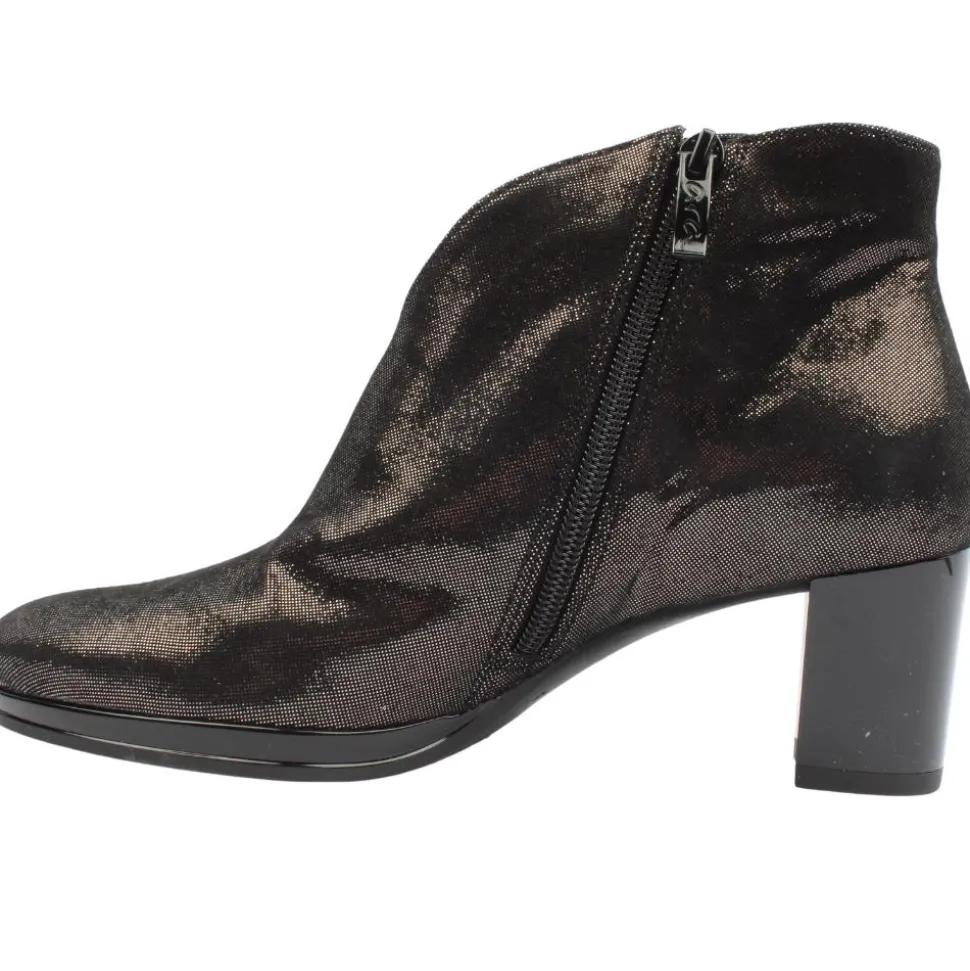 Stylish dressy ankle boots from Ara Shoes. They have a soft black/pewter shimmer upper with a patent heel & outsole for contrast. They have a “V” shape cut at front which elongates the leg.These Ara boots are equipped with a removable high soft cushioned insole for all day comfort.They are a G width, offering extra room for added comfort.