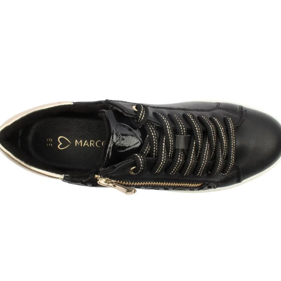 The Marco Tozzi ladies Runner 23701 in a Black Gold is a fusion of style and convenience that redefines casual chic. These eye-catching runners are designed for both fashion-forward flair and practical ease. Enjoy the flexibility of customisation with the removable insole, providing you with the option to tailor the level of comfort to your liking. Whether you prefer extra cushioning or a snug fit. The low profile platform not only enhances the modern aesthetic but also ensures a comfortable and stable stride.