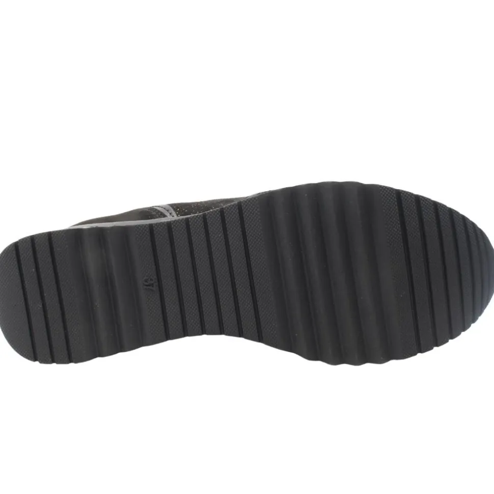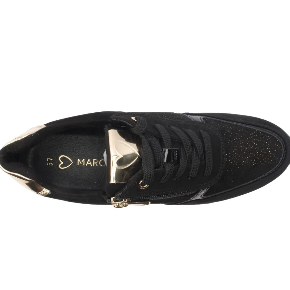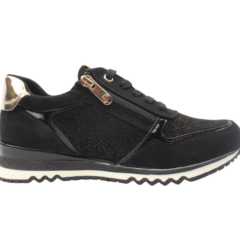 Ladies casual trainers from Marco Tozzi shoes. These ladies trainers have a black faux suede upper with gold speckle detialing. They have a removable insole which allows for an orthotic if needed.The zip & lace closure allows for easy on & off.