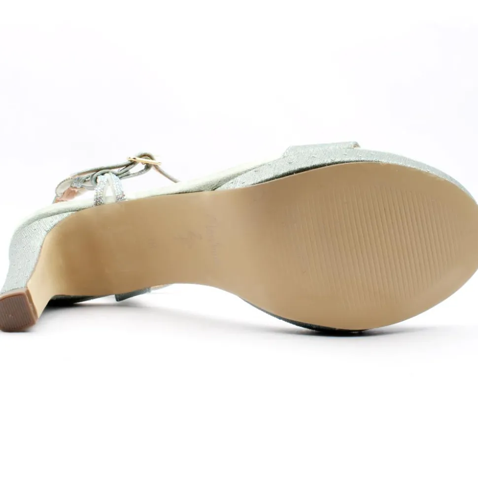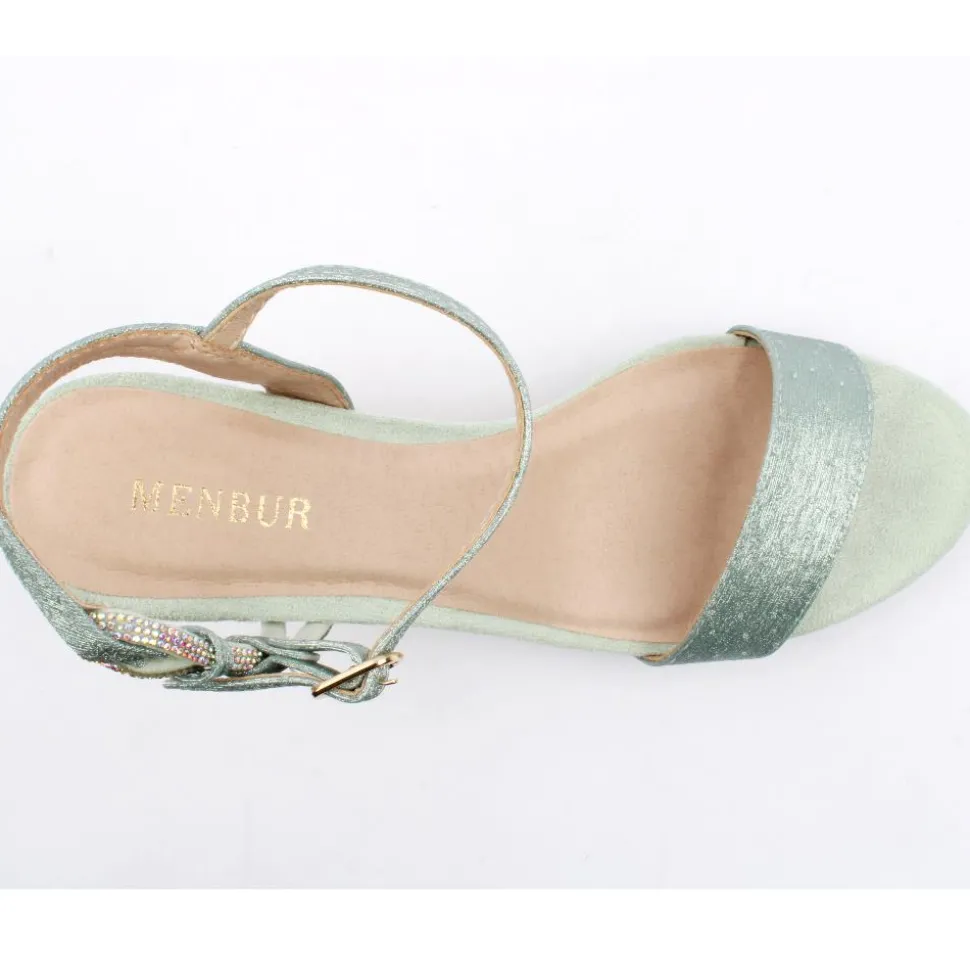 Dressy sandals from Menbur shoes These high heel sandals have a mint green shimmer upper with a buckle strap closure. Perfect dressy sandal for weddings and special occasions. The padded insole and slight platform add to their comfort.
