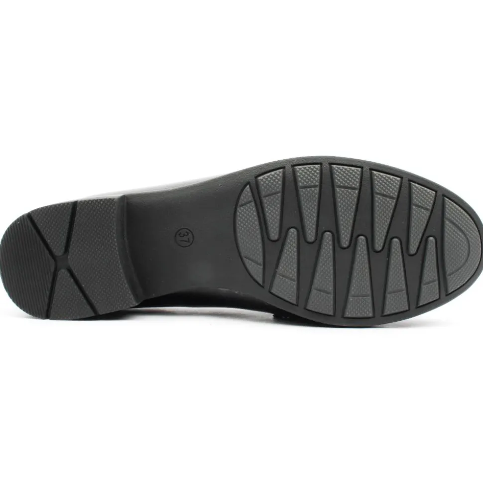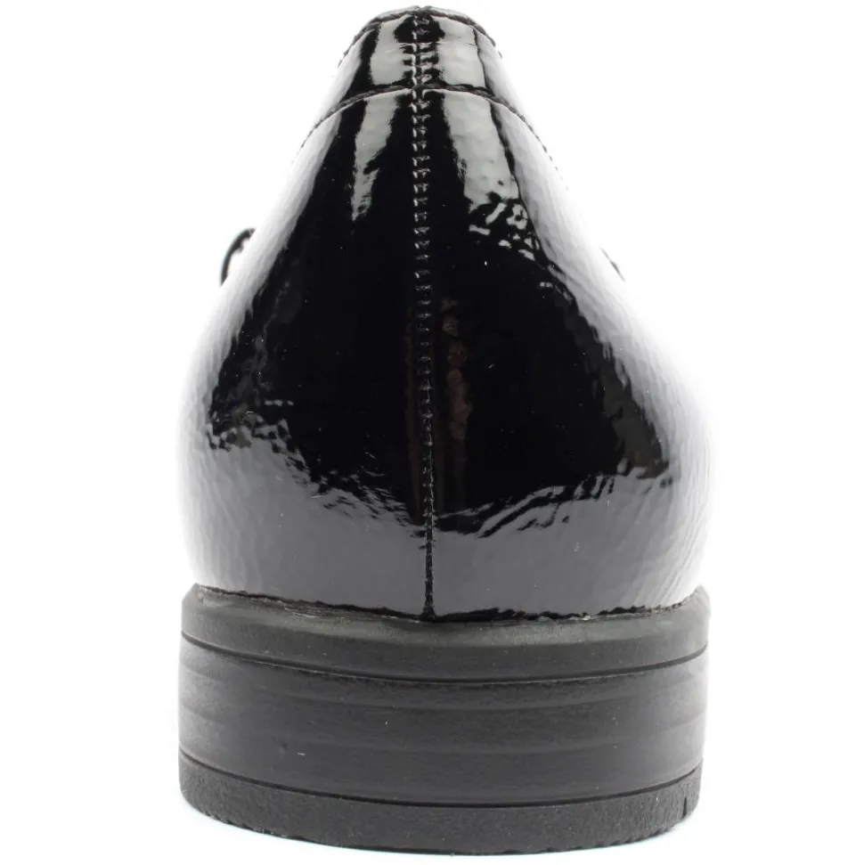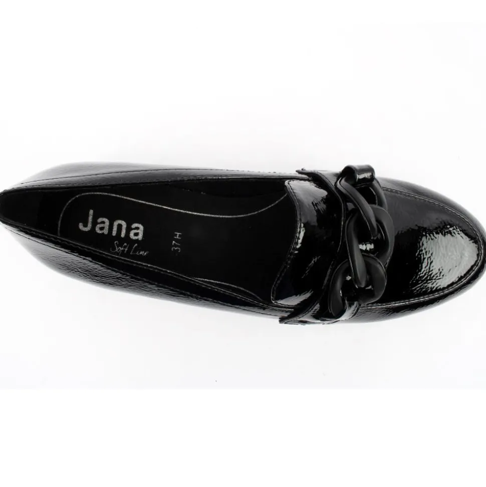 Wide fitting ladies loafers from the Jana Shoes collection. This slip on shoe has a soft black patent upper with chain detailing on front. The shoe is a ‘H Width’ & also has a soft line insole which provides underfoot cushioning ensuring all day comfort.