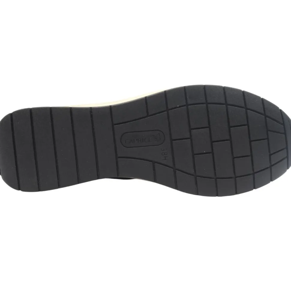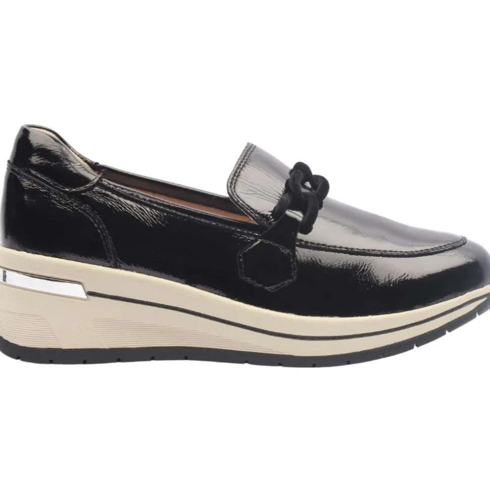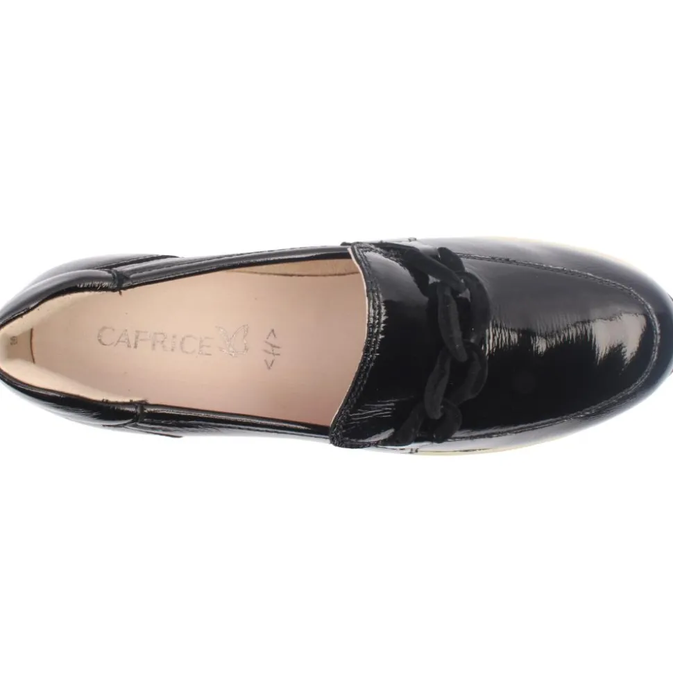 Womens loafers from Caprice shoes. This sleek and versatile shoe features a high-gloss patent leather finish that adds an effortless touch of elegance. Designed with a unique suede fabric panel across the front, it offers a soft, textured feel. This loafer includes a subtle wedge heel lift, providing just the right amount of elevation to enhance posture.