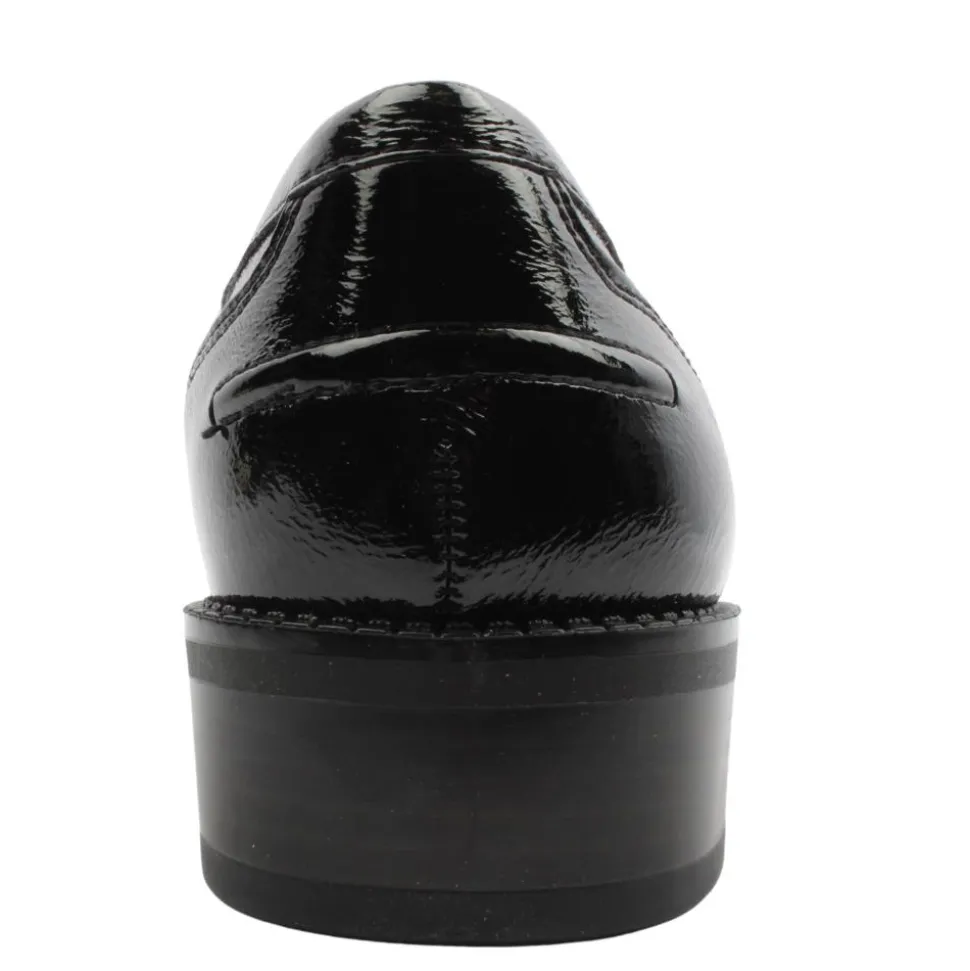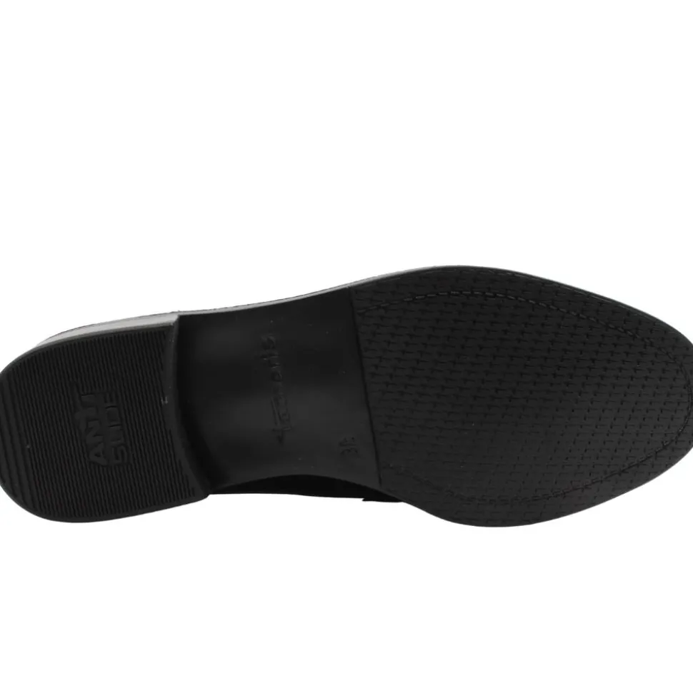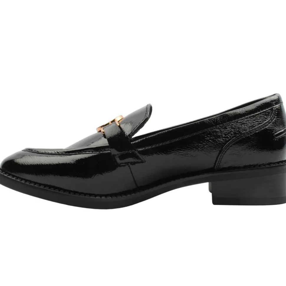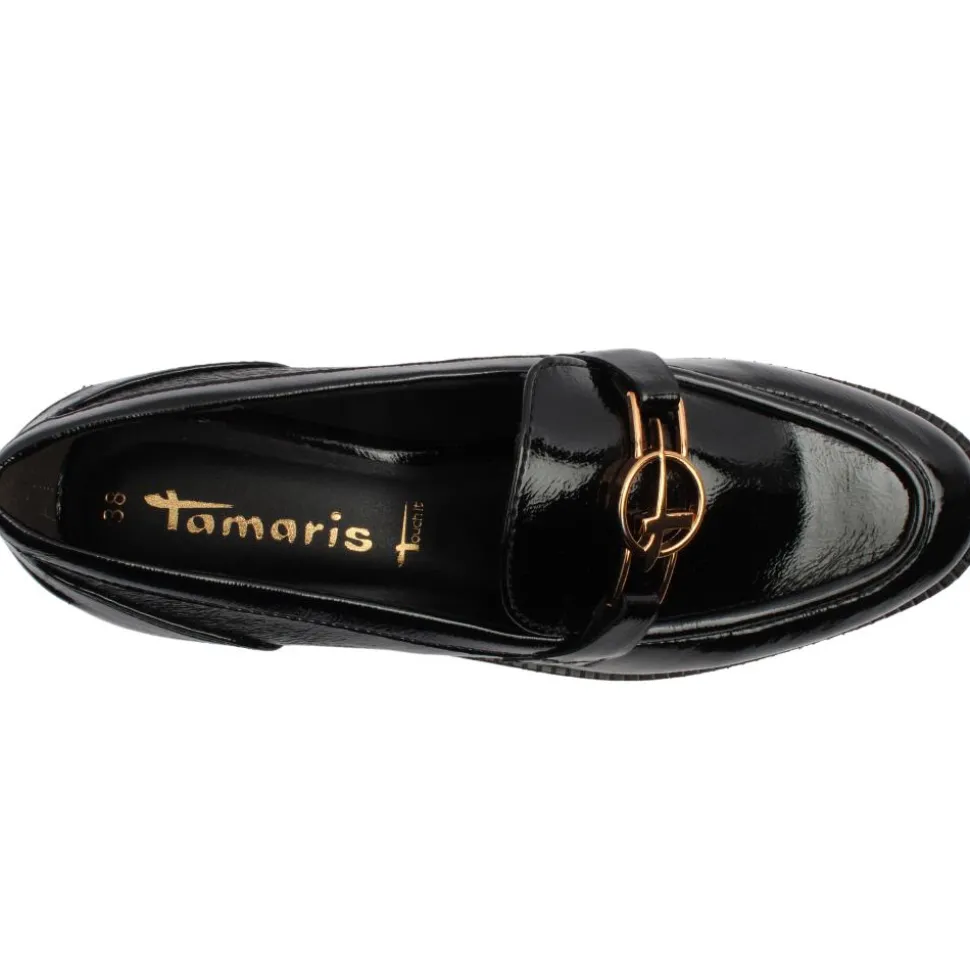 Ladies loafers from Tamaris. These slip on loafers have a black patent upper with a gold accent on the front. Tamaris ‘Touch It’ insoles provide underfoot cushioning ensuring all day comfort. A great style for work or everyday wear!
