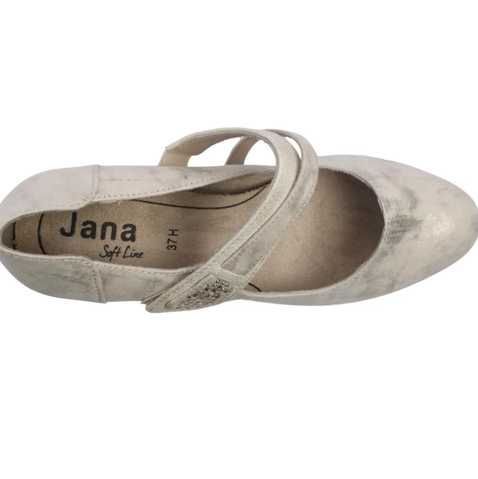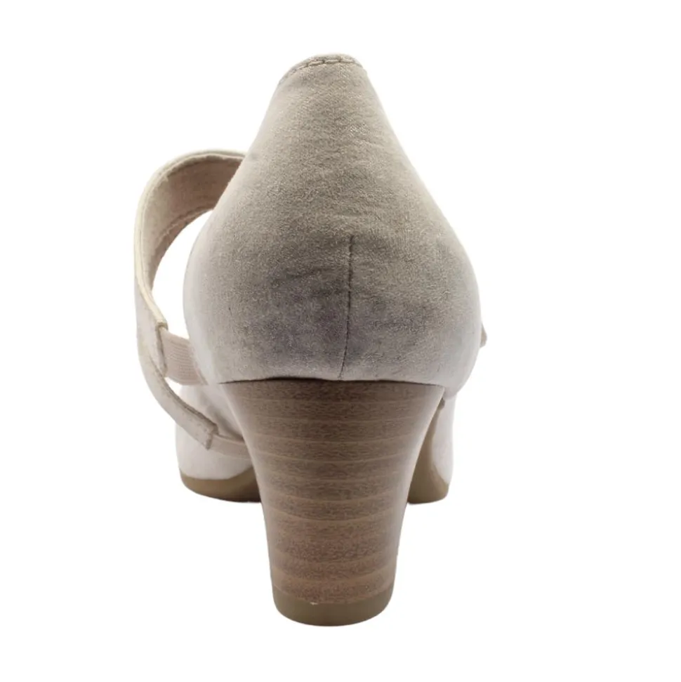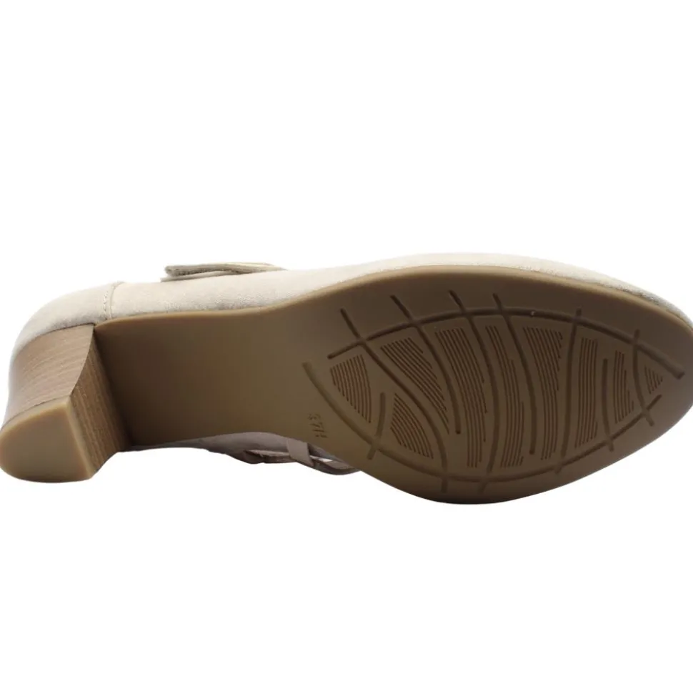 Wide fitting ladies shoes from Jana Shoes. These dressy heels have a soft beige/gold faux suede upper with a velcro strap which allows for easy on/off while keeping the foot secure. The shoe is a H wide fitting style which will provide extra toe room & adds comfort to the shoe.