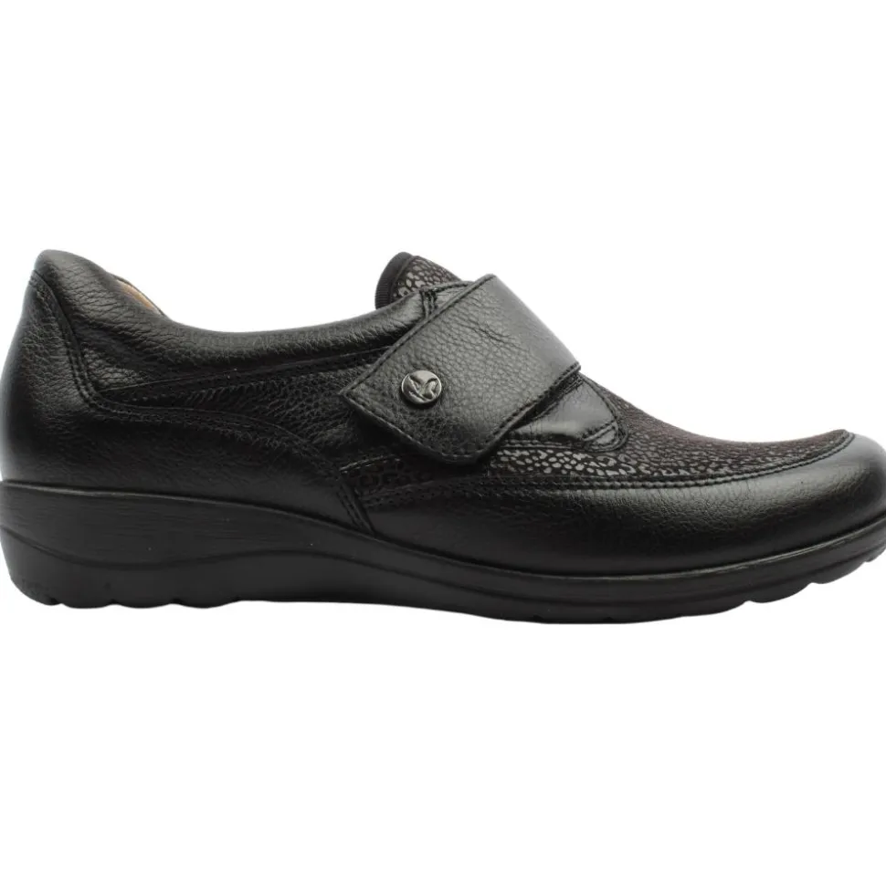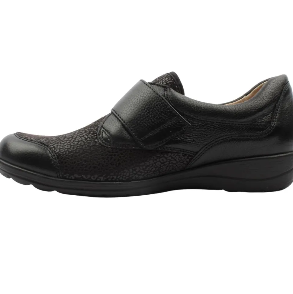 Ladies extra wide fitting shoes from Caprice shoes. They have a velcro strap closure and fold down tongue for easy on/off. This style is a H exta wide fit and the cushioned leather insole is removable allowing for a wider and deeper fit for those who need it.The soft stretch upper is ideal for those with problem feet.