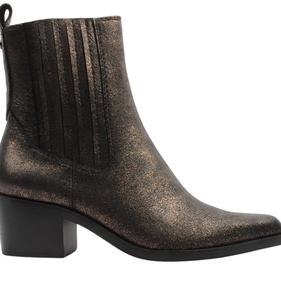The Tamaris ladies chelsea boot. These boots feature a striking bronze shiny upper that catches the light beautifully. The unique V-shaped toe design sets them apart from traditional Chelsea boots.