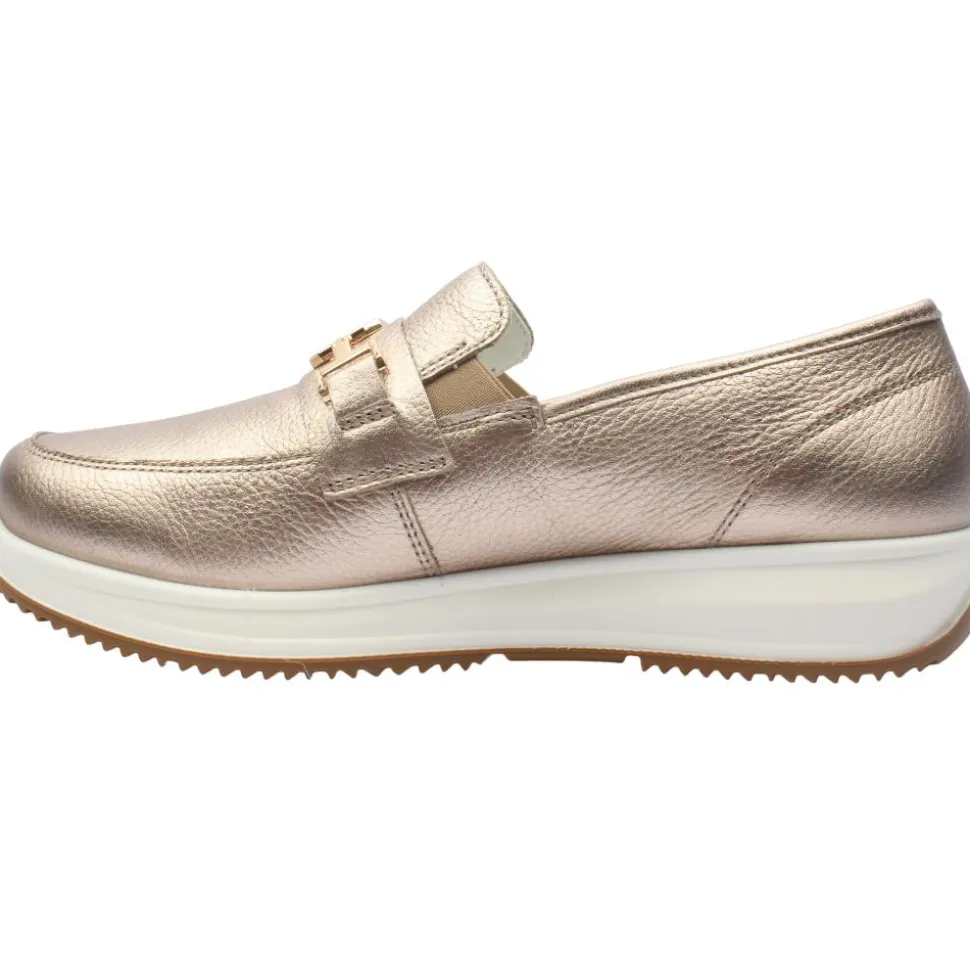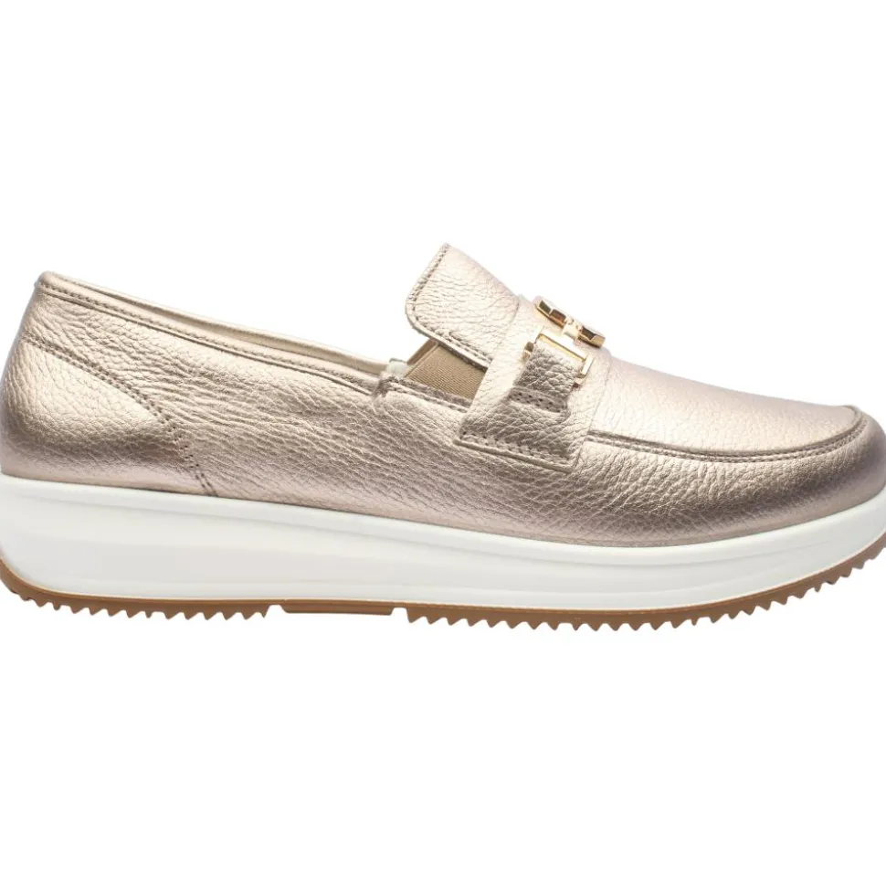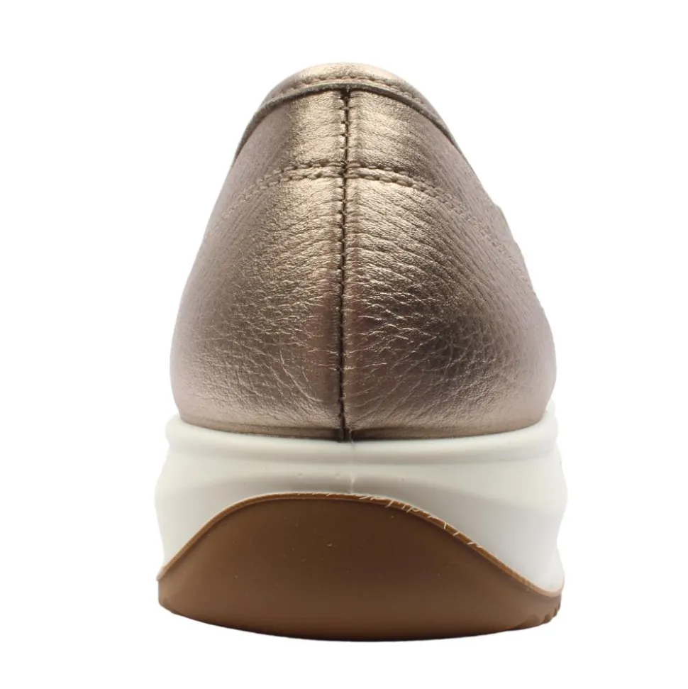 Stylish ladies wide fitting shoes from Ara Shoes.These ladies slip on shoes have a metallic leather upper, adorned with a stylish chain detail on the front.T hese shoes are a H Wide fitting, ensuring optimal comfort and width. Perfect for everyday casual attire, they offer both style and practicality.