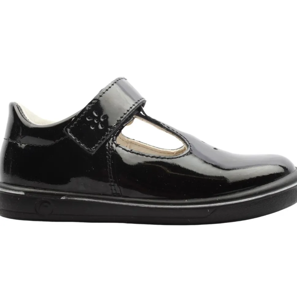 Little girlsT-Bar shoes by Ricosta Pepino Shoes. A lightweight and flexible shoe which has a soft black paent leather upper with punched hole floral detail. This shoe has a T-bar closure with velcro strap for extra support . Removable leather insole with a fitting guide around the toe area. Suitable as first shoes.