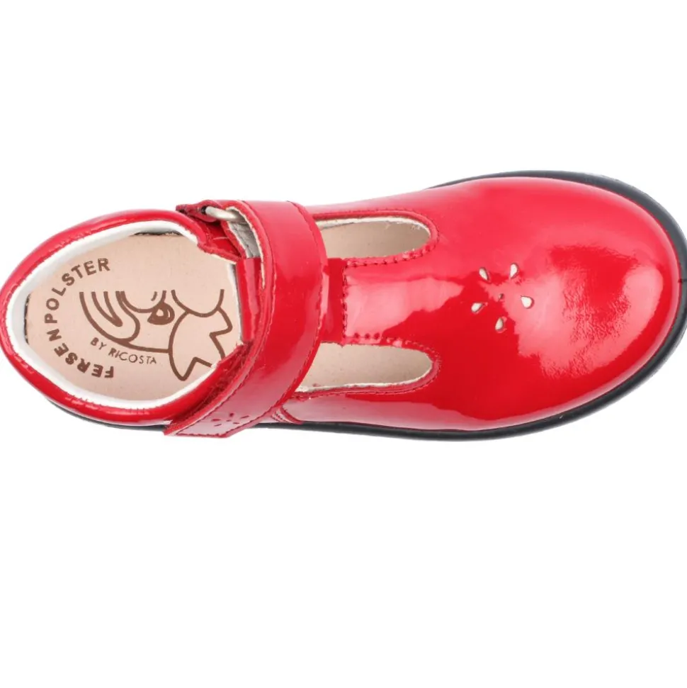 Little girls shoes by Ricosta Pepino Shoes. These Ricosta shoes are a lightweight and flexible shoe which has a red patent leather upper with punched hole floral detail. This shoe has a t-bar closure with velcro strap for extra support .Removable leather insole with a fitting guide around the toe area.