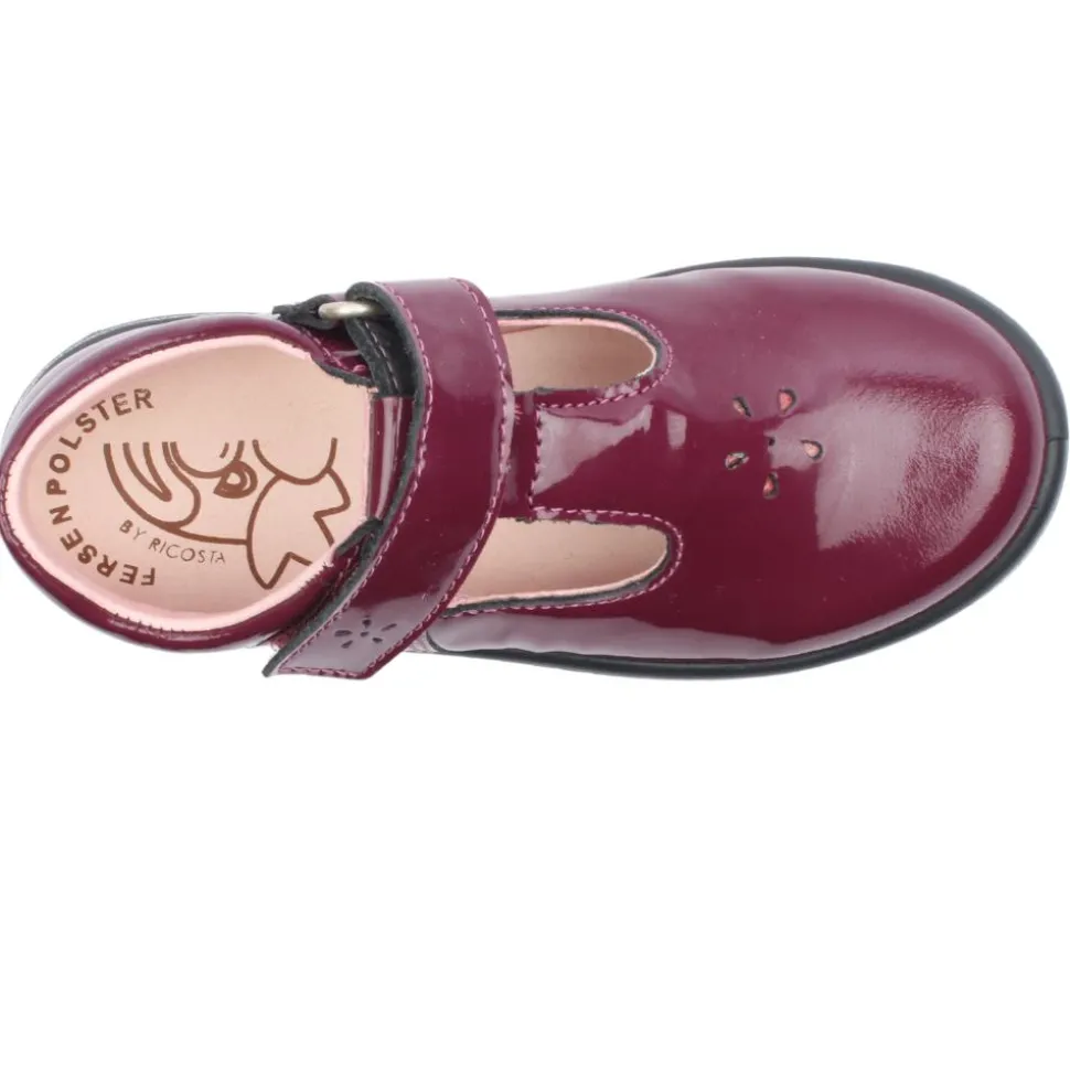 Little girls shoes by Ricosta Pepino Shoes. These Ricosta shoes are a lightweight and flexible shoe which has a wine patent leather upper with punched hole floral detail. This shoe has a t-bar closure with velcro strap for extra support .Removable leather insole with a fitting guide around the toe area.