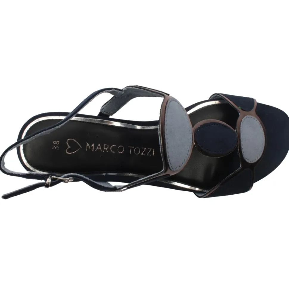 Dressy sandals from Marco Tozzi Shoes. This sandal has a lovely navy upper with blue detailing. This sandal has a cushioned insole & a low block heel for added comfort. A buckle closure allows for easy on/off.