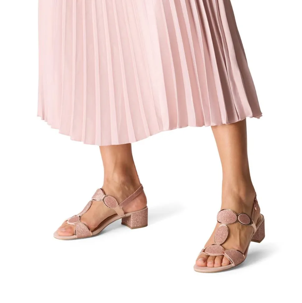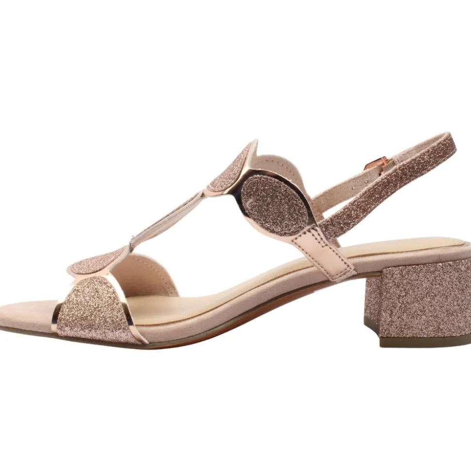 Dressy sandals from Marco Tozzi Shoes. This sandal has a shimmering rose gold upper which will add a touch of sparkle to any outfit. This sandal has a cushioned insole & block heel for added comfort and stabiltiy. A buckle closure allows for easy on/off.