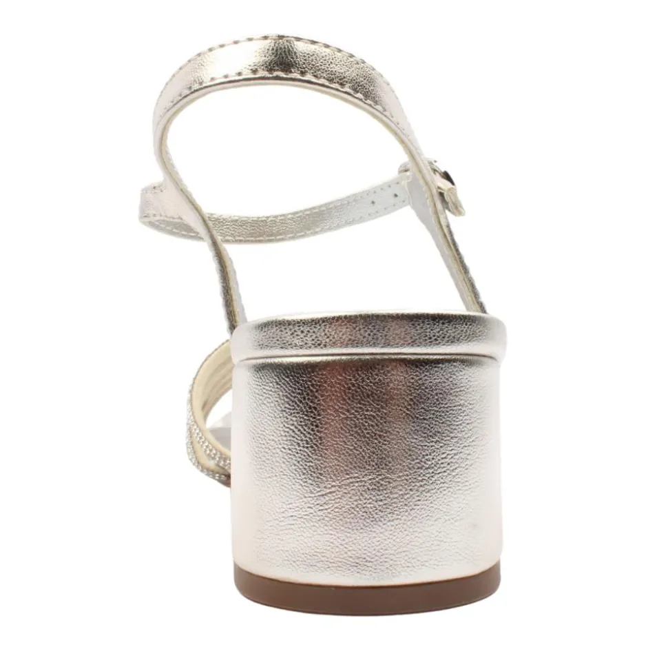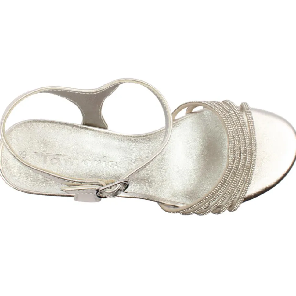 Dressy low heel sandals from Tamaris Shoes in a platinum upper. These sophisticated sandals feature a dazzling diamante-embellished strappy design, perfect for those special occasions. The low block heel and the padded insole ensures a comfortable feel.