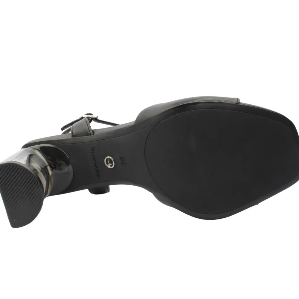 Step into comfort with the ladies heels from Tamaris shoes. A secure buckle strap around the ankle and a chic strap across the toe provide a perfect fit and effortless style. A uniquely crafted, see-through block heel adds a modern, eye-catching touch, ensuring you stand out with every step. Contemporary squared-off details elevate the design, offering a trendy yet timeless appeal.
