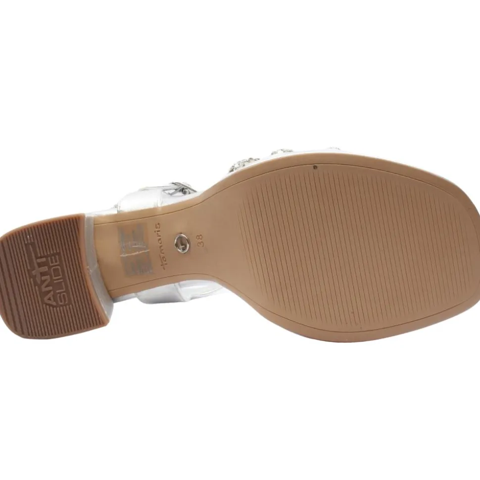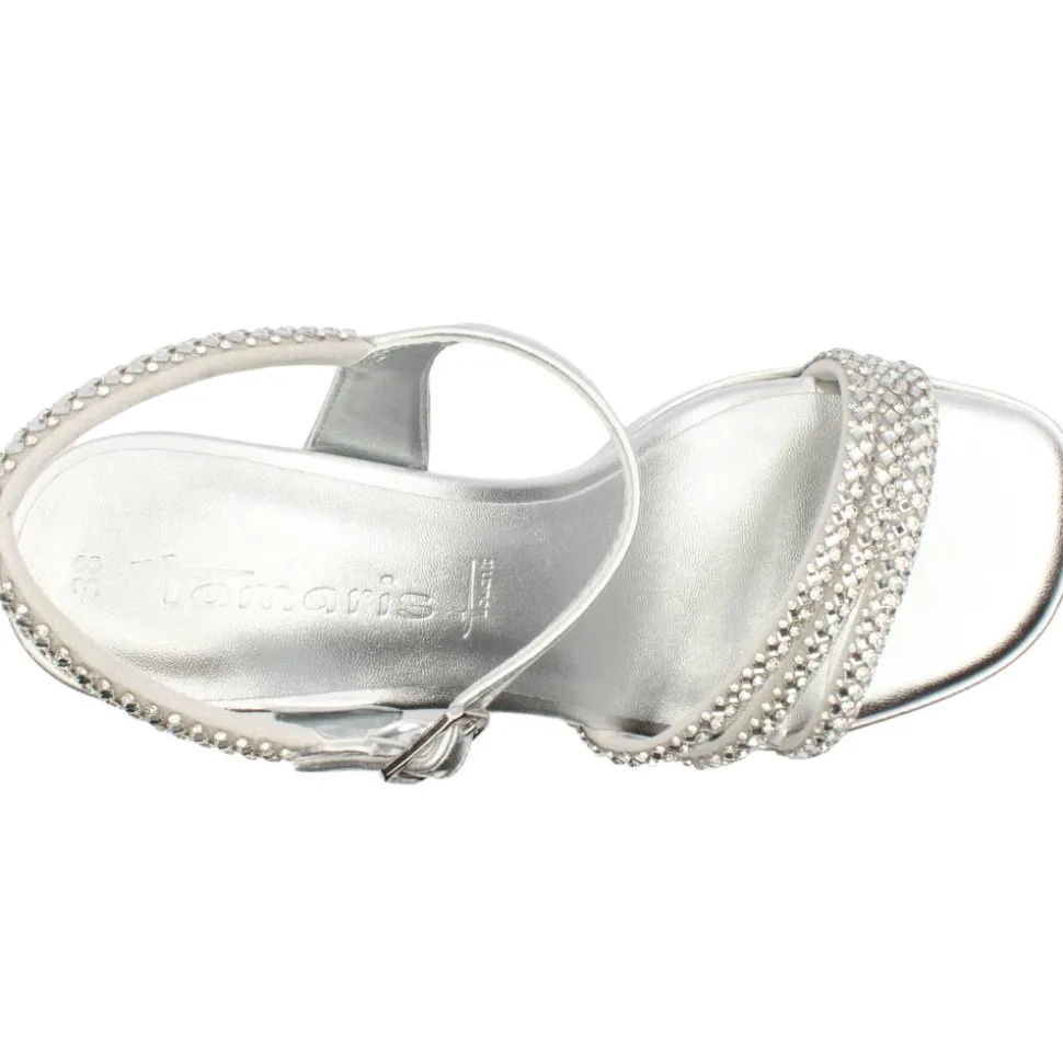 Step into elegance with the Tamaris 28355 dressy sandal, designed to add a touch of sophistication to any outfit. Featuring a beautiful silver finish, this sandal is complemented by shaped silver diamantes across the front, creating a subtle yet eye-catching sparkle. The Block Heel offers a comfortable and stable lift, ideal for both style and support. Adjustable buckle at ankle for a secure and customized fit. Perfect for evening events, weddings, or any dressy occasion.