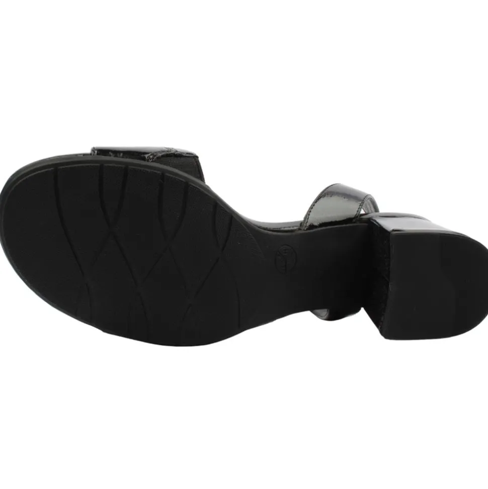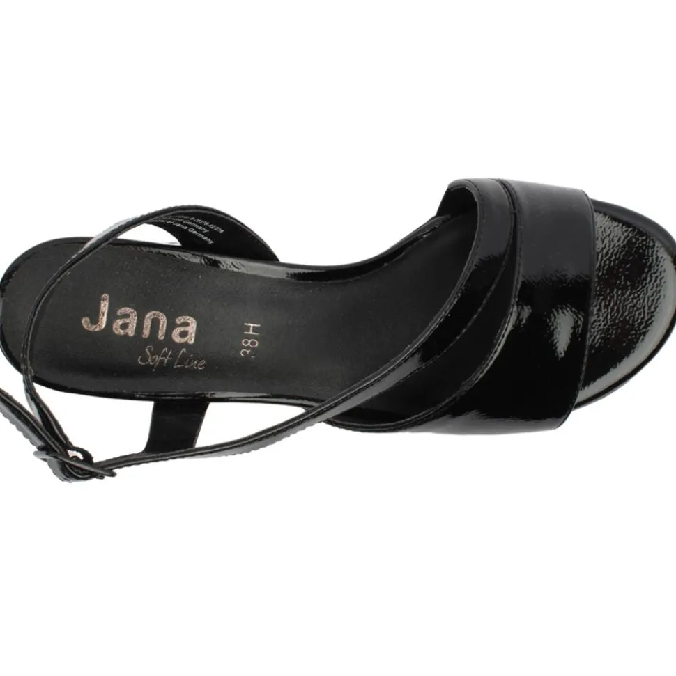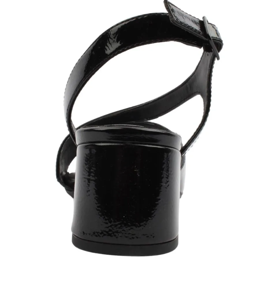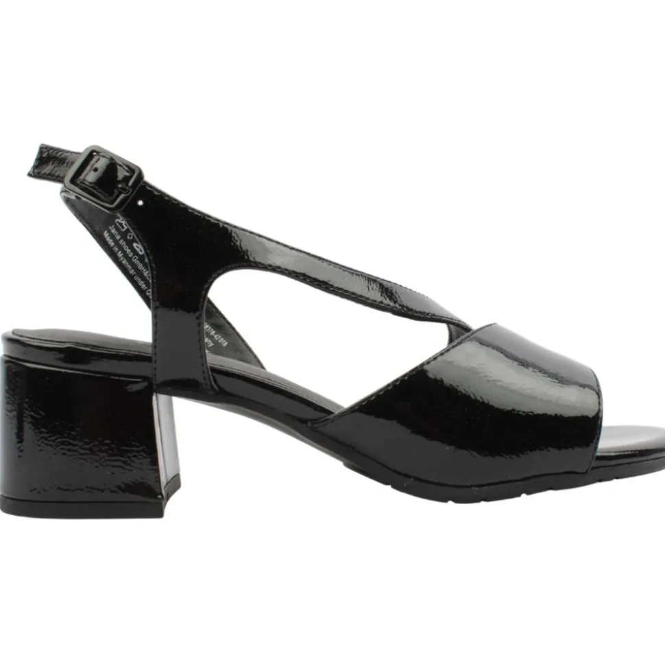 Introducing this Jana block heel sandal, designed for a comfortable fit. Crafted with a stylish black patent strappy upper and featuring a dainty ankle strap closure. Enhanced with a block heel and cushioned insole for added comfort. This sandal is a H width. Vegan Friendly!