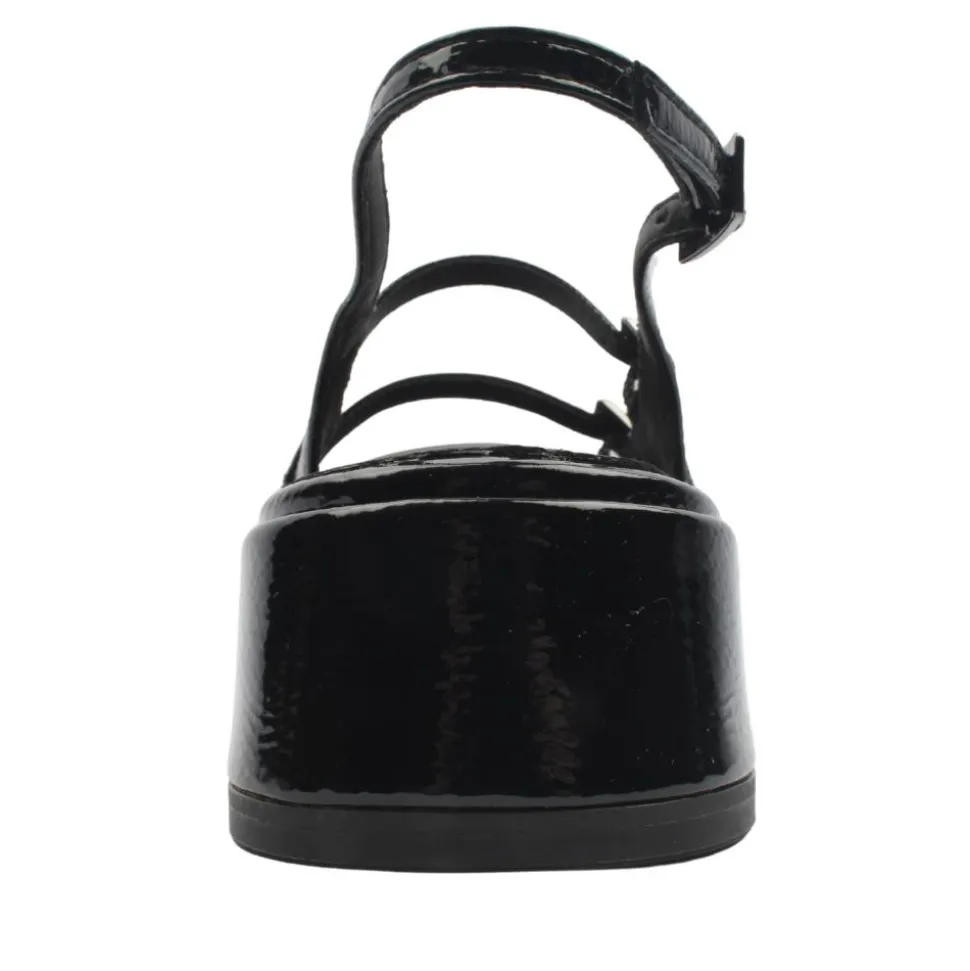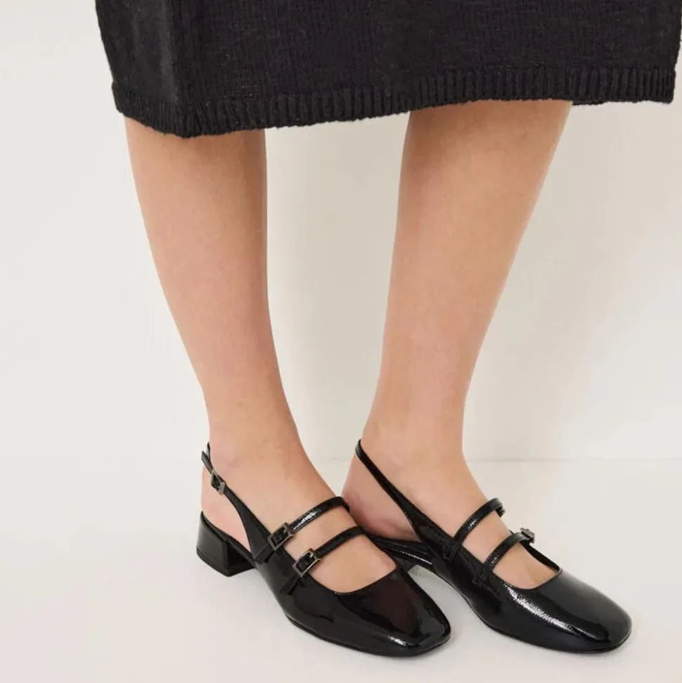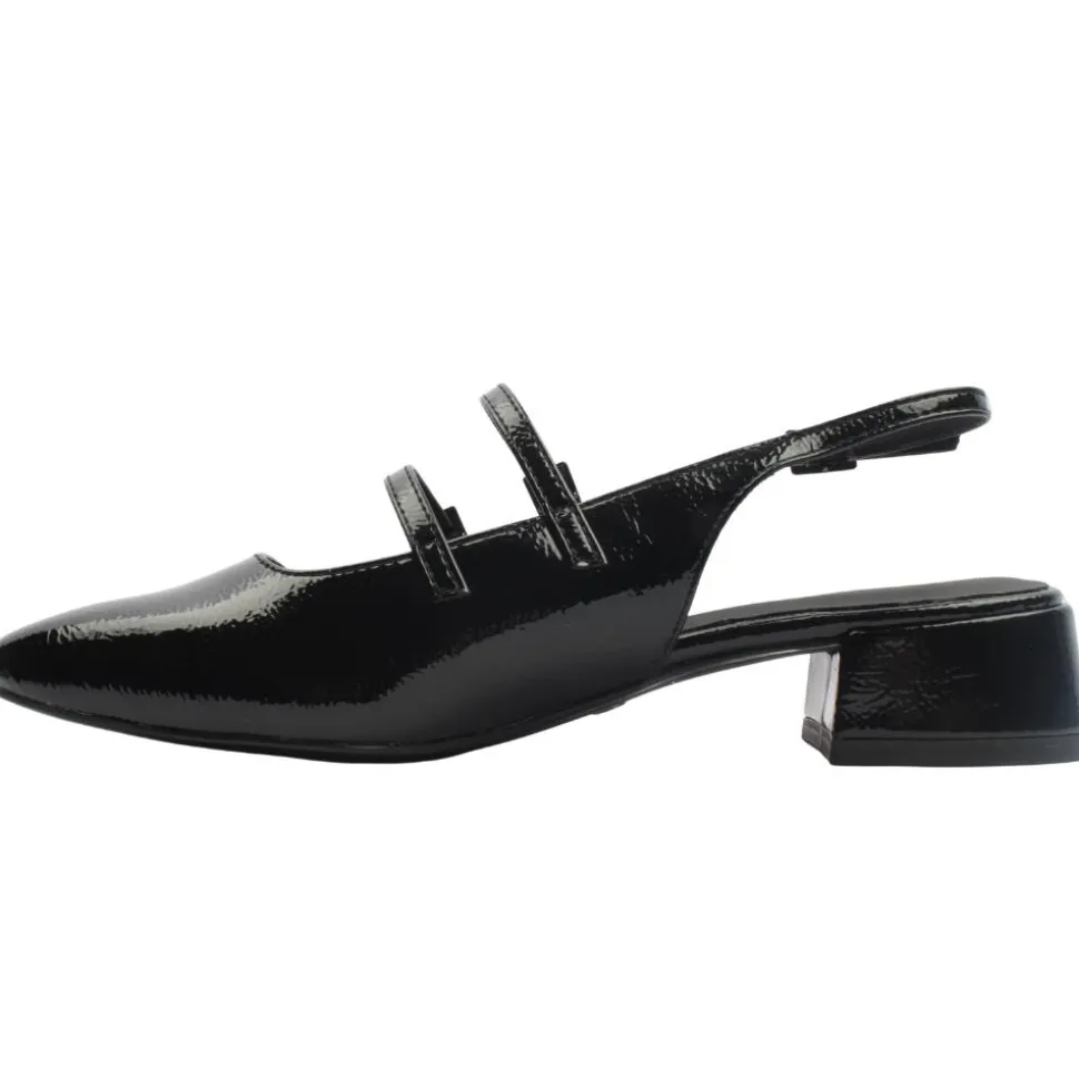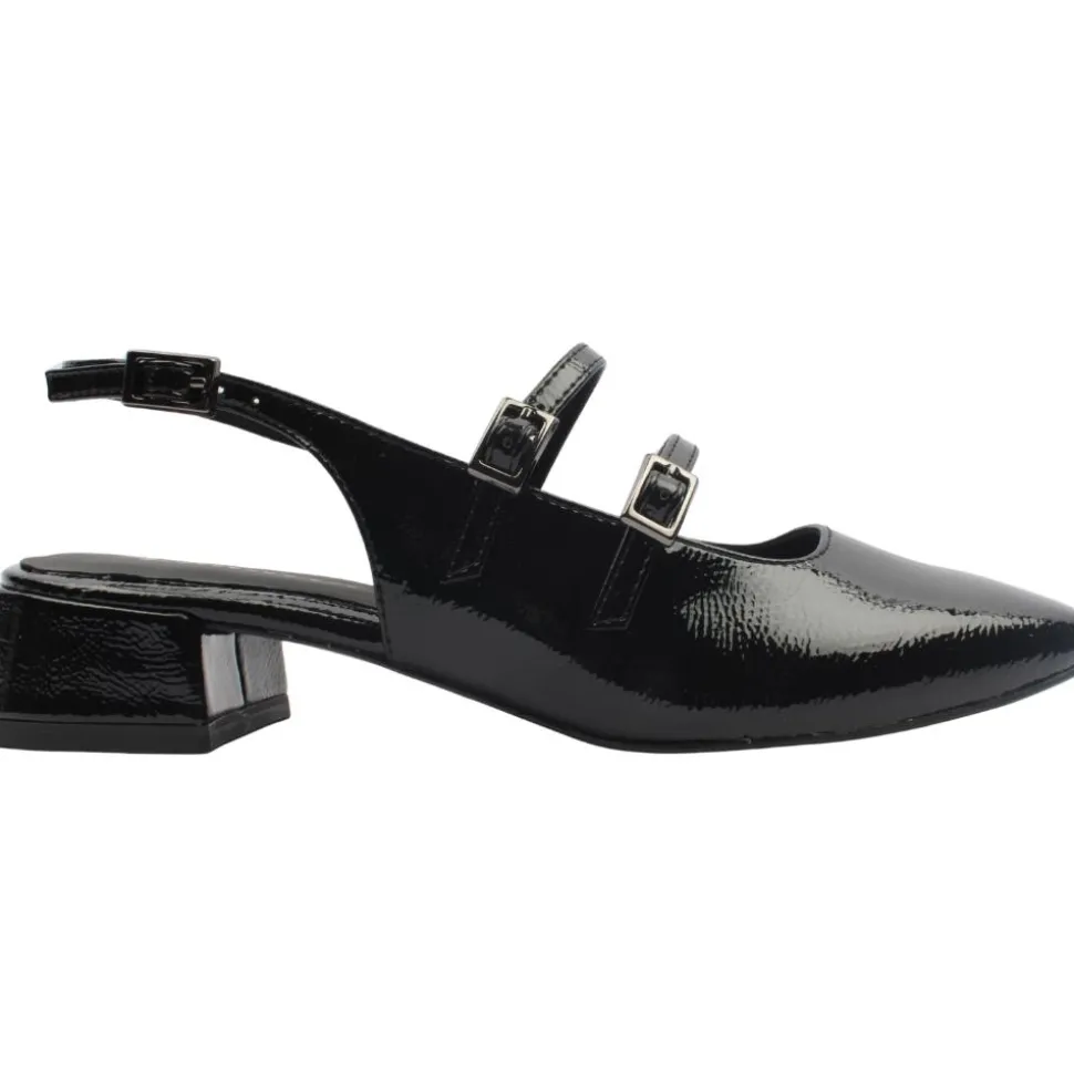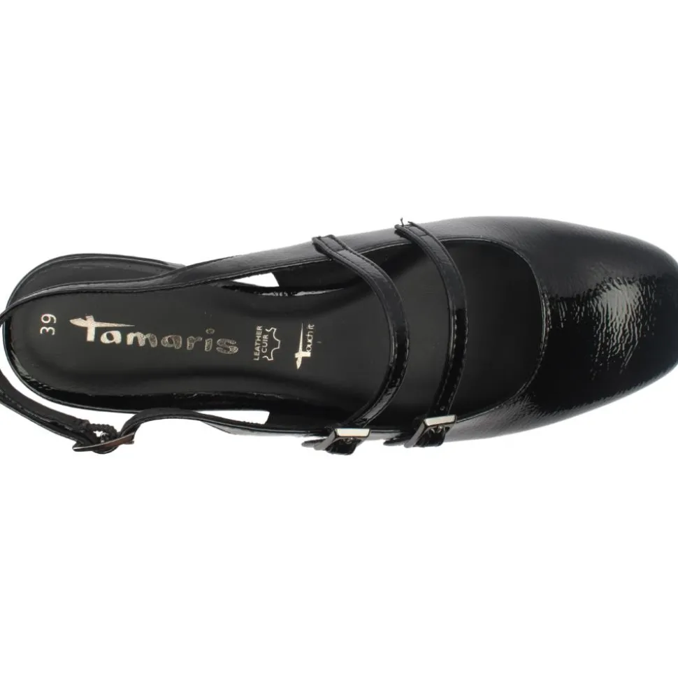 Ladies low sling black heel from Tamaris shoes. The Tamaris 29510 slingback shoe is a sophisticated choice for those seeking elegance and comfort. Featuring a black patent upper, this shoe is designed with a buckle around the heel and two strap buckles across the foot, ensuring a secure and adjustable fit. The low heel provides subtle elevation, making it suitable for extended wear