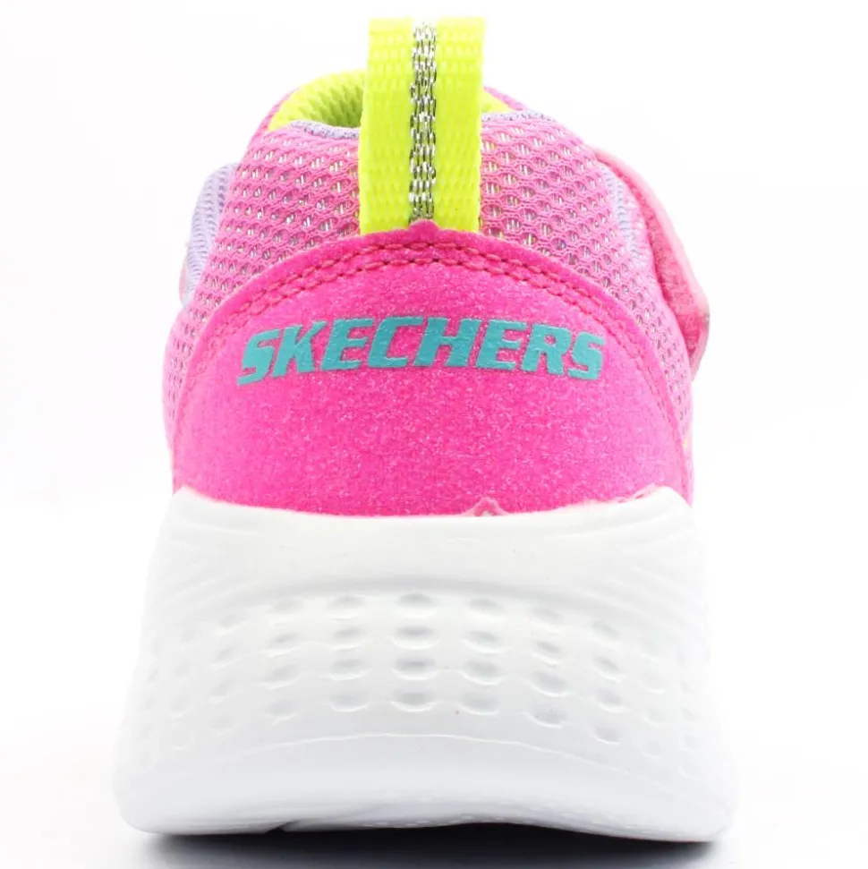 Lightweight runner from Skechers. This Skechers runner has a bright pink upper with glitter detail. A velcro strap & lace closure allows for easy on/off. Perfect runner for everyday wear!