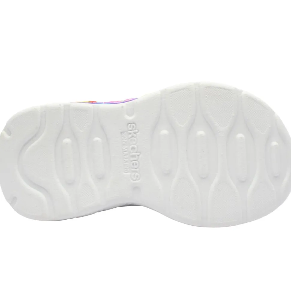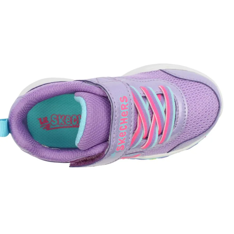 Bright,fun and built for little adventures – the Skechers 303158N in playful purple is the perfect everyday shoe for busy little feet. Featuring fun graphics on the outsole, these runners bring a touch of personality to every step. Designed with a fuller toe box for growing feet, plus cushioned support, these shoes offer all-day comfort. The lightweight and flexible design makes moving easy, while the double Velcro straps ensure a secure, easy fit.